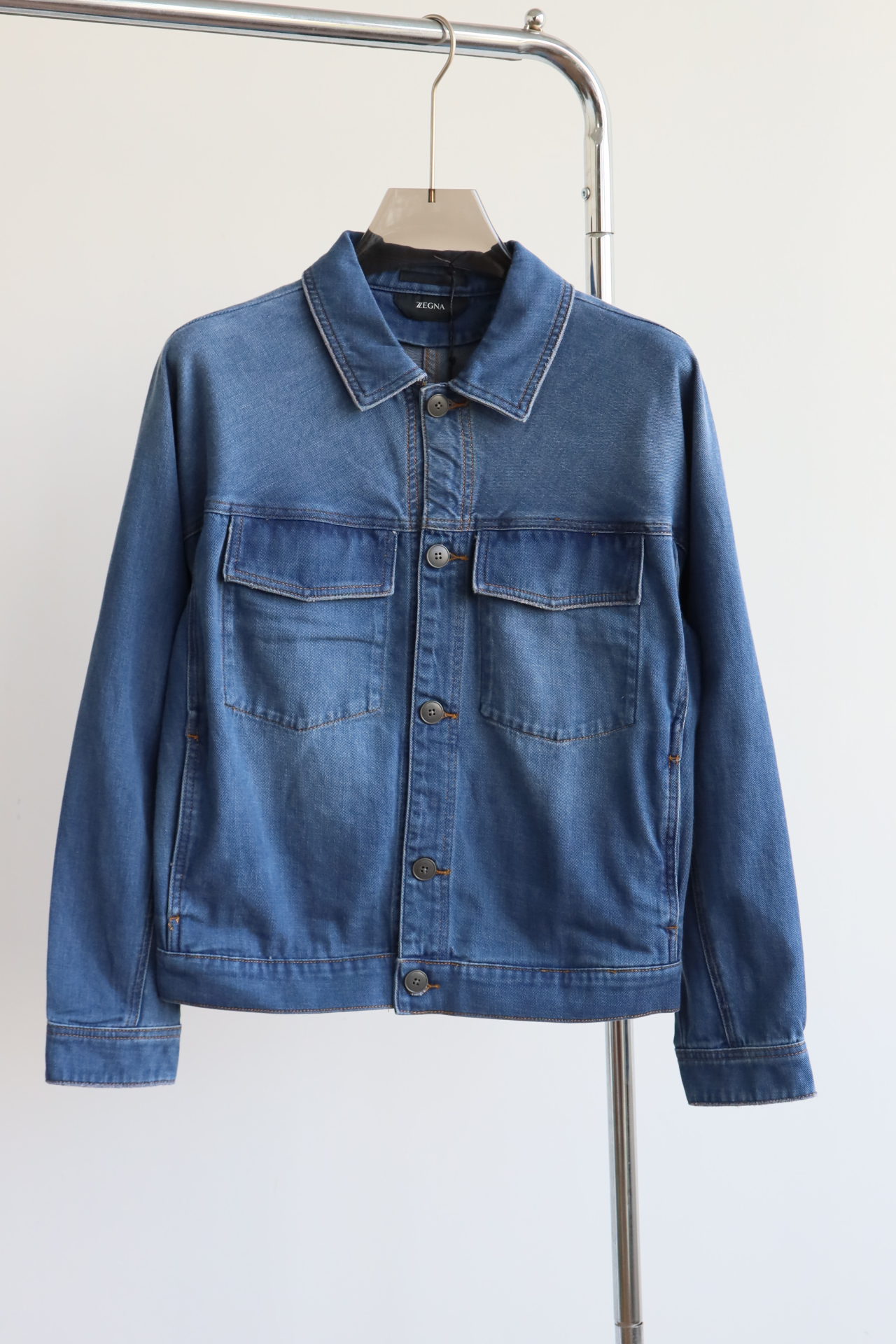 胸前双口袋装饰,定制木纹缝制纽扣、
