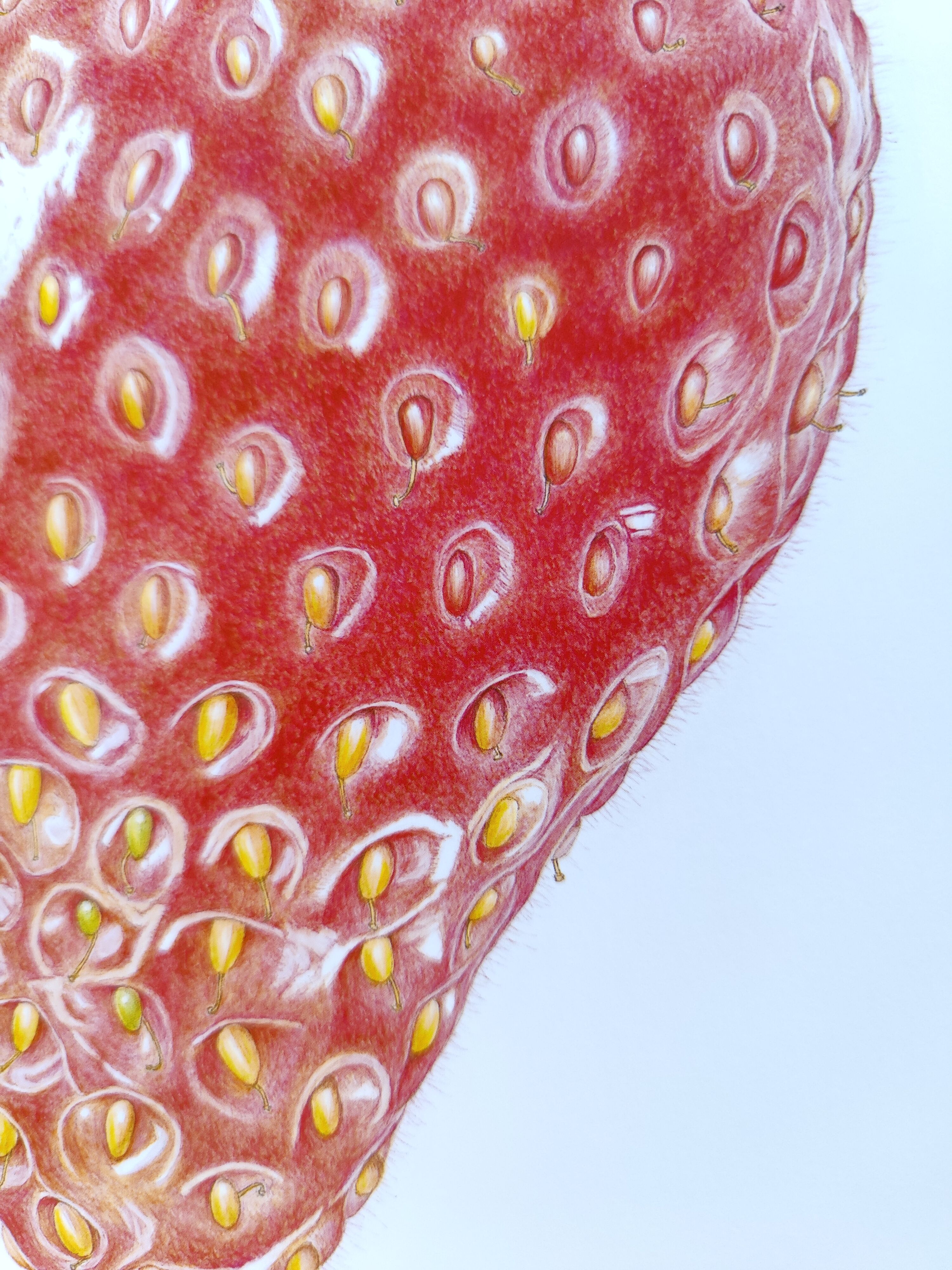 草莓边边的绒毛都精致到很分明,这简直就像工笔画!