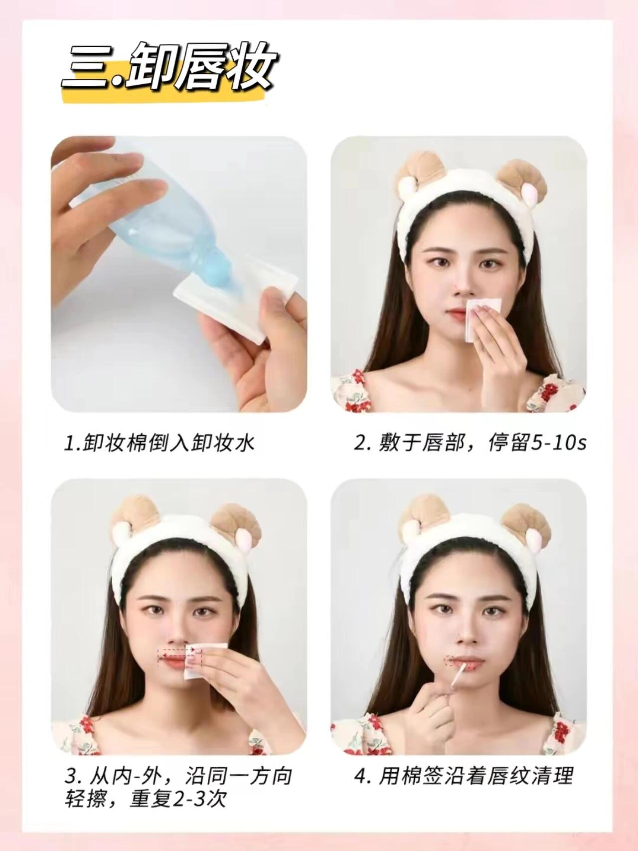 ③卸唇妆✅唇部也建议使用专门的眼唇卸妆液来卸妆。方法和卸眼妆是一样的,湿敷之后轻轻擦拭即可。但注意不要边揉边擦,这样做会加深唇纹⚠️