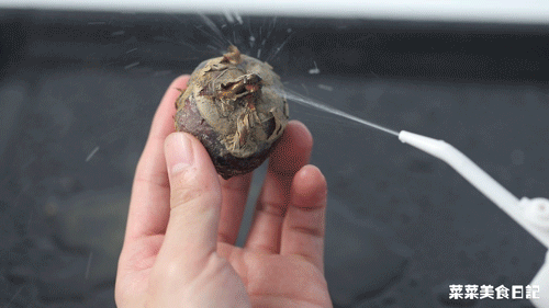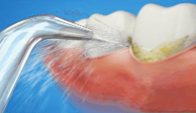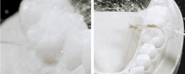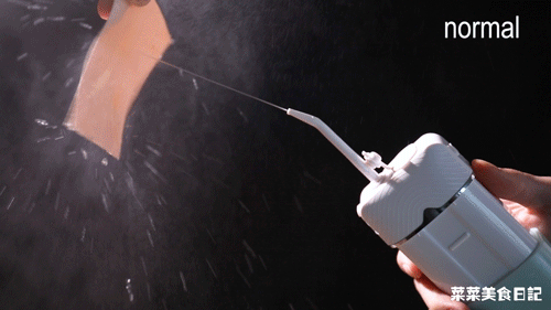 这时我们再用冲牙器对比下,顺着玉米缝隙简单一冲,干干净净(这个场景可以模拟我们的牙缝,肉菜纤维就是这样冲出来的)