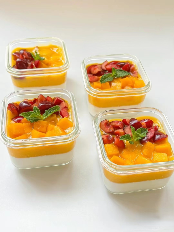 3.蒸好的双皮奶,倒入芒果奶昔,放上宝宝爱吃的水果即可。