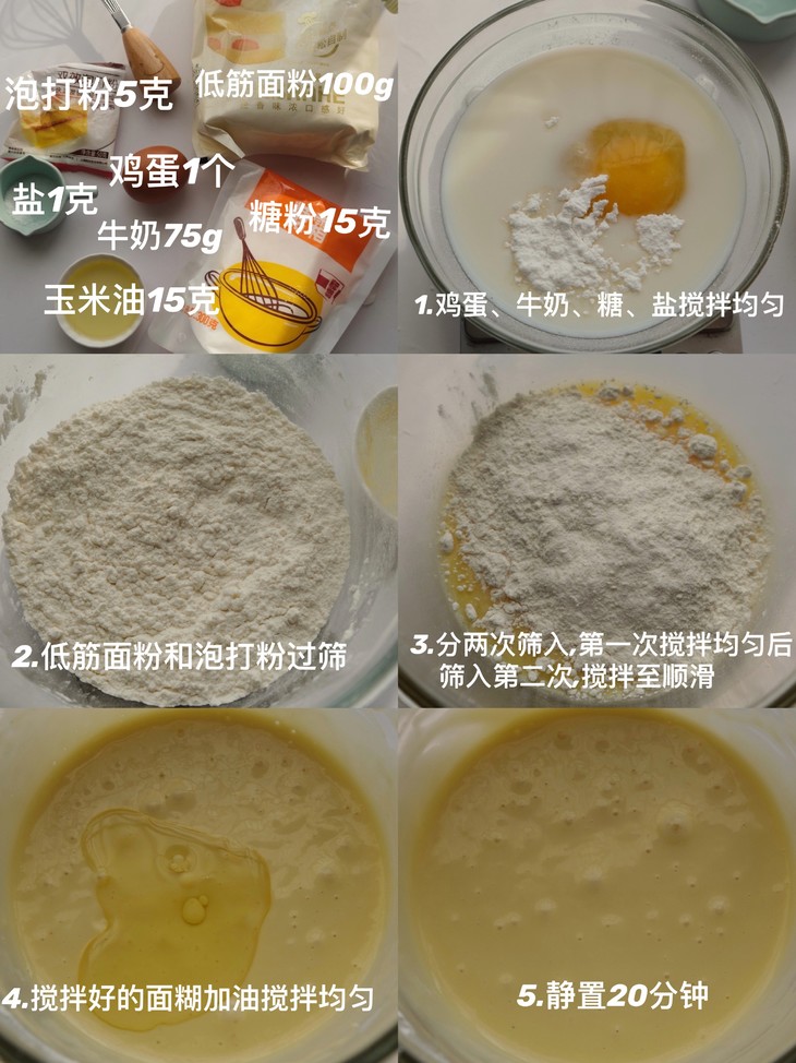 2、碗中放入鸡蛋、牛奶、糖、盐搅拌均匀,低筋面粉泡打粉混合均匀,分2次筛入,第一次搅到无颗粒状态后筛入第二次,最后搅拌至顺滑即可.