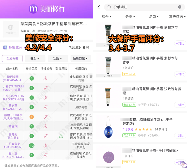 两款产品在专业美妆平台的安全评分达到4.2/4.4,远高于普通护手产品均分!