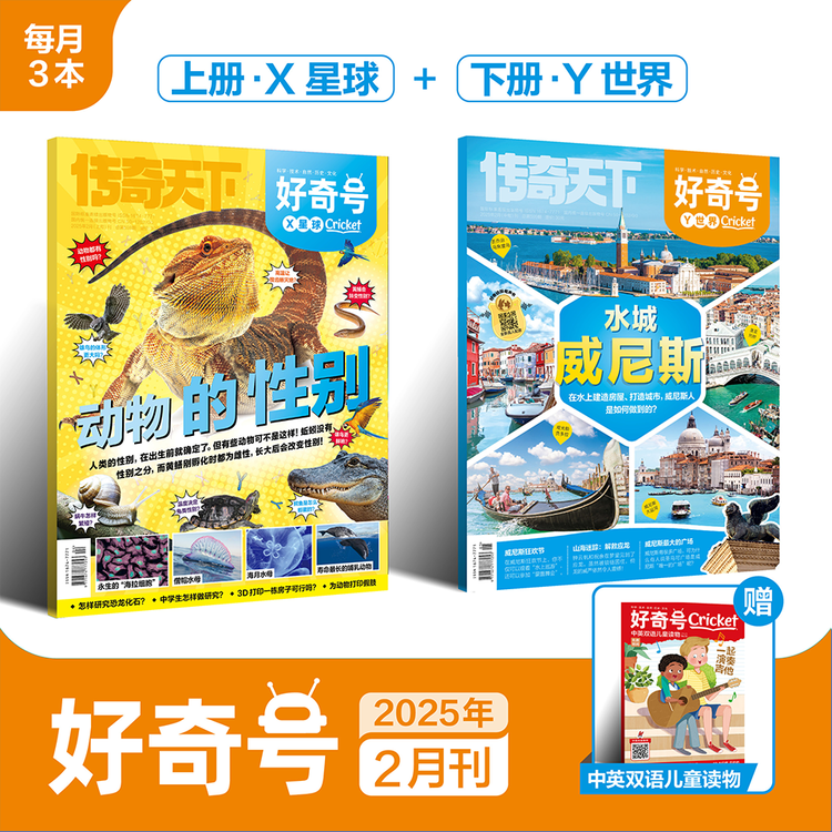 Cricket Media版权合作,内容选自Cricket Media旗下的重点刊物,涵盖了科学、历史、文化、文学等多个领域,为中国6-12岁孩子提供大容量、高品质的通识读物。每期还加赠一份中英双语读物,中英对译蟋蟀王国的儿童故事,用原汁原味的美式语境,助力孩子英语学习。
