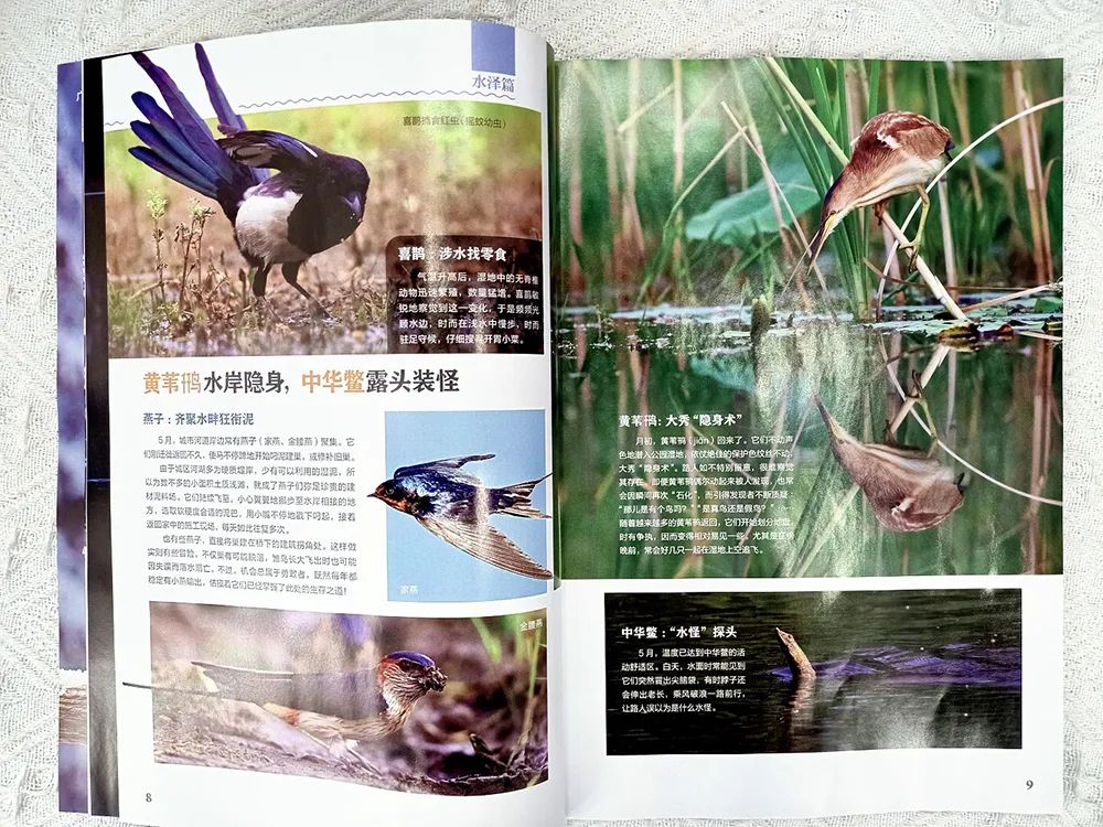 在这里,你能看到在喜鹊在涉水找食的动作神态,时而在浅水中慢步,时而驻足守候,也能看到突然冒出尖脑袋 的“水怪”——中华鳖。