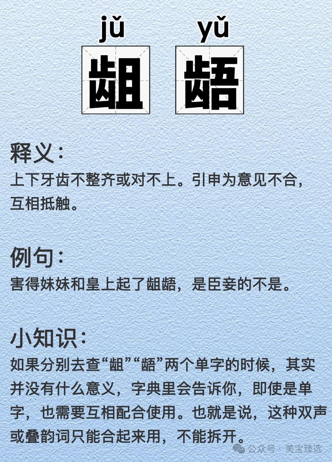 看偏旁肯定都和牙齿有关,指的是:上下牙齿不整齐或对不上。引申为意见不合,互相抵触。看拼音构成,韵母都是ü 。汉语里有一种词,叫做双声叠韵词。这里“龃龉”便是叠韵。