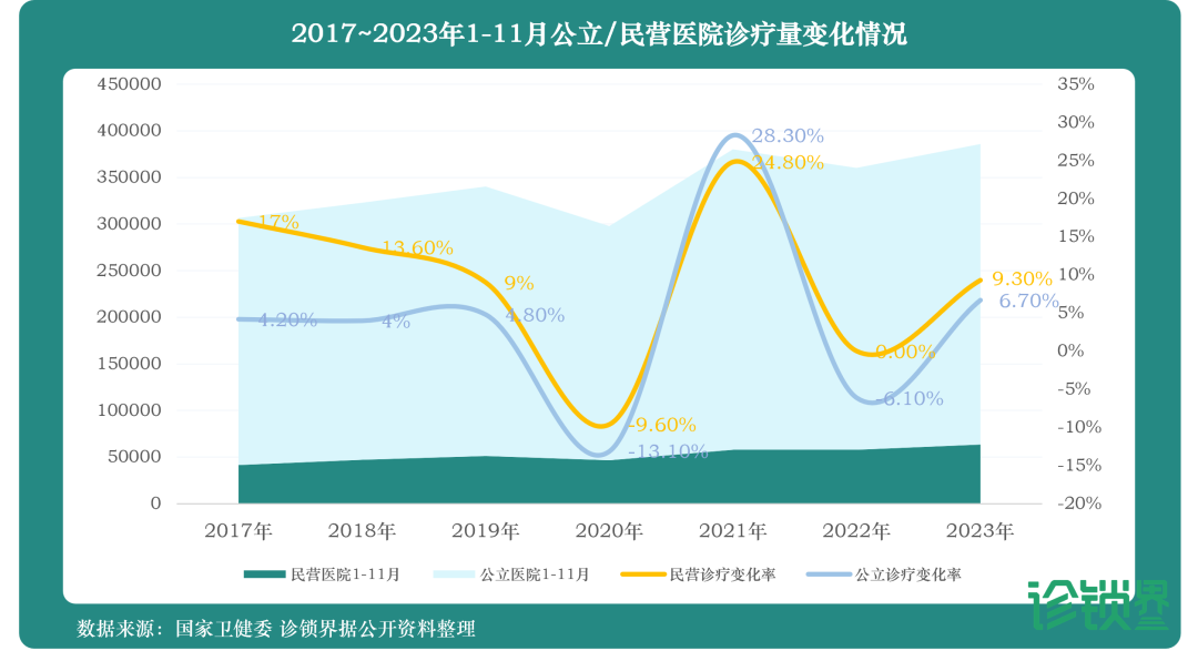 虽然民营医疗行业正面临行业洗牌,多家民营医院陆续传出烂尾、破产、注销、重整的公告,但根据国家卫健委统计数据,2023年1-11月全国民营医院诊疗量达6.4亿人次,同比增加9.3%,高于公立医院6.7%的增速,保持了恢复增长的态势。