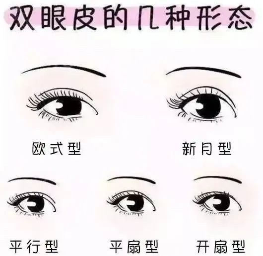 双眼皮类型大致分为平扇型、开扇型、新月型、平行型、欧式型。其中,平扇型、开扇型和平行型 会更适合大部分东方人。