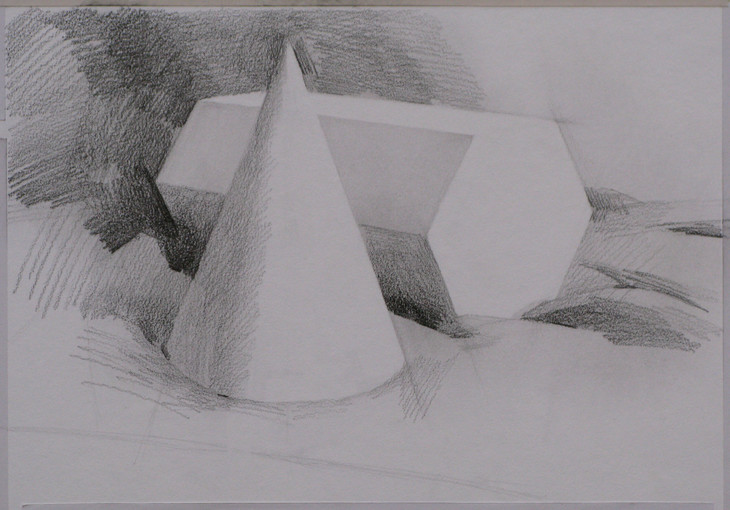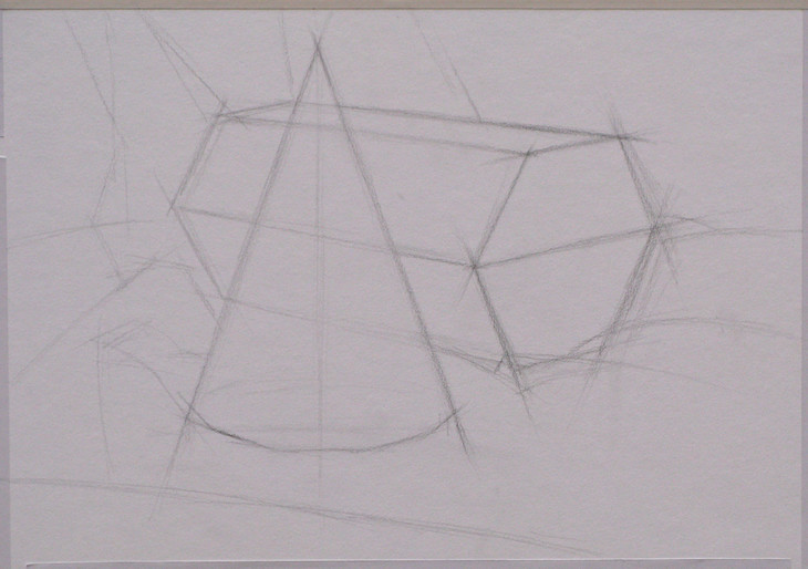 第一步:用2B铅笔起稿,先用铅笔的侧锋轻轻的画出六棱柱的轮廓,再画出圆锥体,注意物体与物体之间的位置关系。