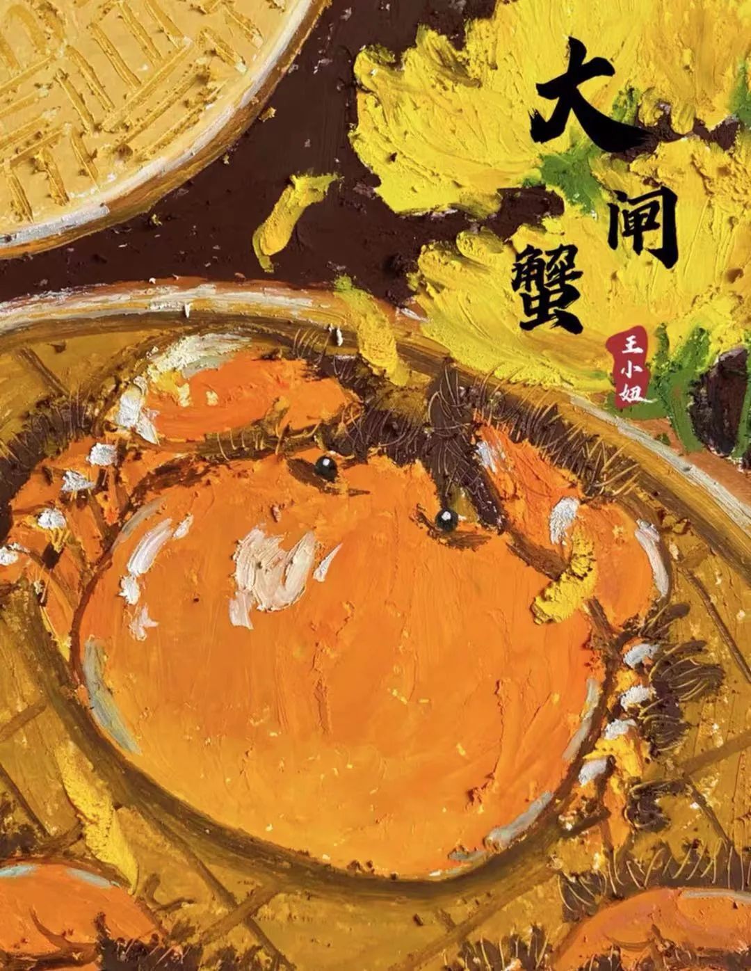 同理,勾勒细节的时候,比如山峦树木的纹理、大闸蟹的须须,也少不了刮刀的功劳哦。