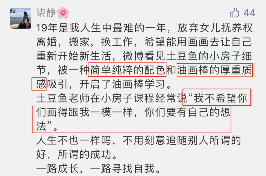 “生活再艰难,也要像油画棒一样,不要追随别人所谓的好,所谓的成功。”