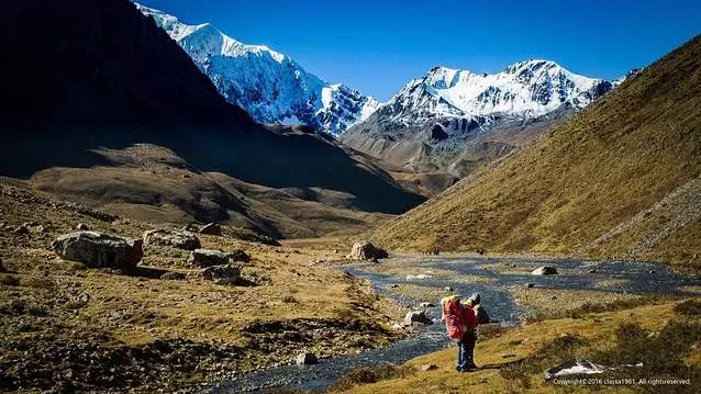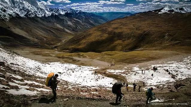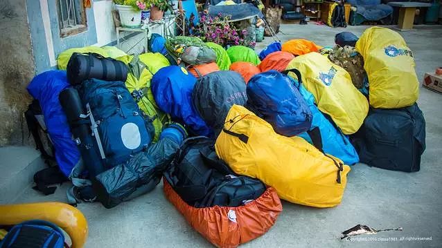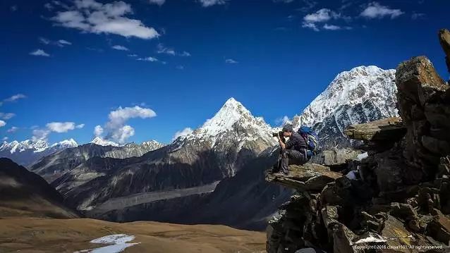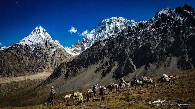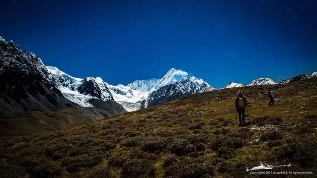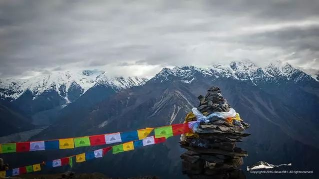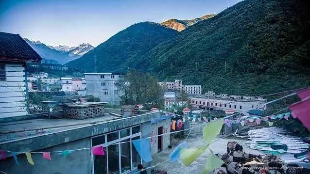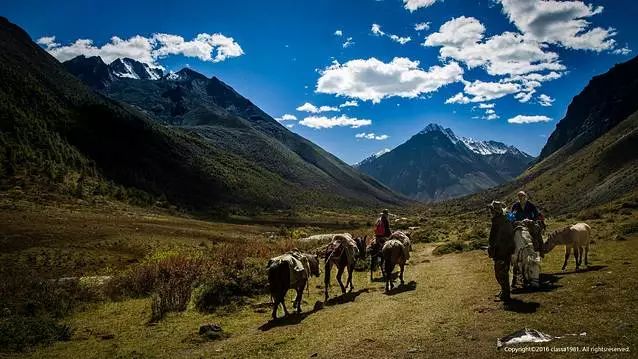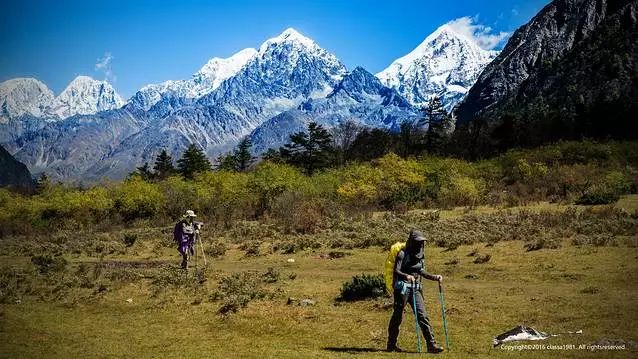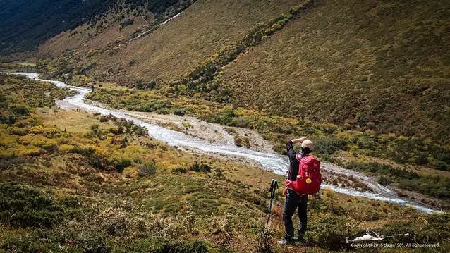 站此行向导扎西的家里,在挂满经幡院落中,周围是崇山峻岭的包裹。在北方秋意正浓的时候,这里还是一片绿意盎然的景象。晨光将近处的山峰装扮了不同的色彩,从墨绿到翠绿到金黄变幻着…… 远远的可以望见白雪和冰川覆盖的山峦,也标注了我们前进的方向。呼吸在略显稀薄的空气中,思维已经随着目光远去,去寻找那份久违的感动。在山间,一排电线杆穿越而过,也将我们的思绪拉回到现实中,是时候进山了!