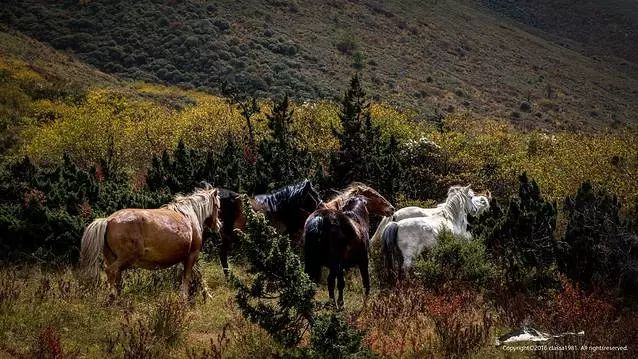 随着山势的下降,我们再次回到水边,往返着跨越这条从莫溪沟交融变大的河流。随着水势绕过一道道山脚,在远处的云雾中一座座小房子若隐若现,稀疏的停靠在小路两侧。走进村落,不见人踪,只有原木和树枝做成的篱笆,和被篱笆割裂成的一块块天然的牧场。马群在牧场中悠闲的走着,时而低头享受着牧草的芳香,时而抬起头,与远处的你对视,片刻后,一声嘶鸣转身离开。