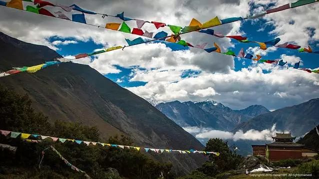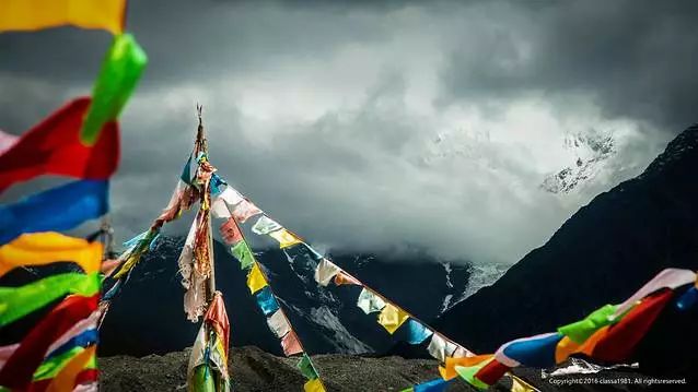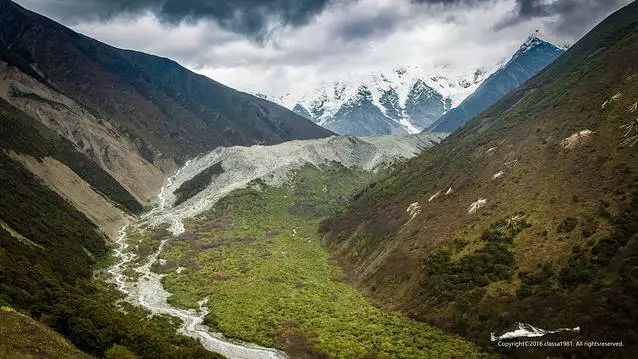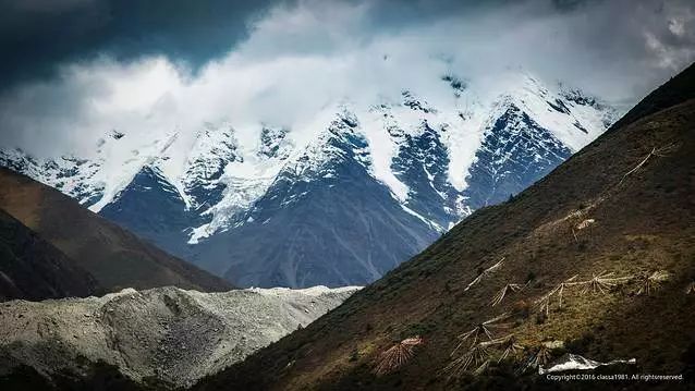 远处的云遮住了贡嘎山的主峰,只留下了一条碎石和融水组成的银河,从云层中宣泄而下,在漫山的绿中显得格外鲜艳。没有了神山的耀眼,两旁山壁上的经幡变得显著起来。在海拔 4000 米以上,在人迹难及的峭壁上,五彩的经幡结成塔状,诉说着修行者的情怀和心声,迎风抖动经久不变。