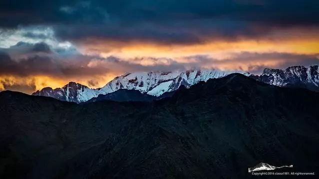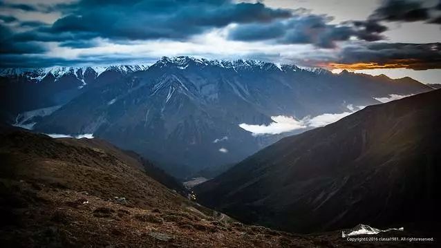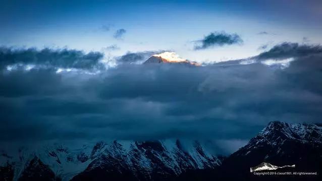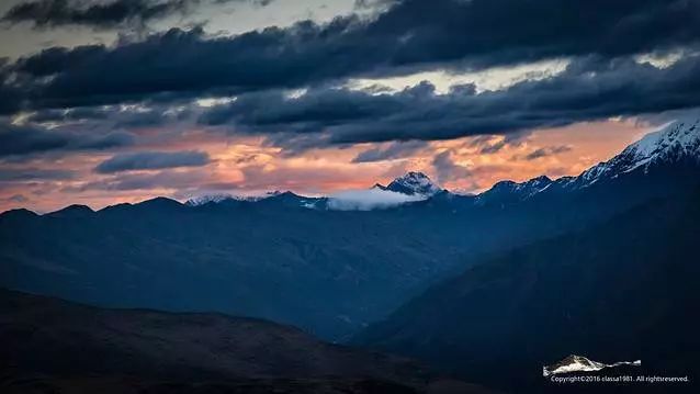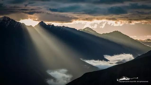 不知何时,远处的天地间变得红火起来,眼前的世界也变得明亮。厚重的云层恋恋不舍的压在贡嘎山上,没有一丝离开的迹象,好似少女头上的面纱,遮住了山峰,分割了天空。初升的朝阳散着火热的光,染红了东方的天际,也点燃雪山上的云彩,燎原般的烧着远处的山峰。红日霞光未尽,透过云层和山峦的缝隙,洒下道道金光。在神山之巅,在佛国圣地,这一束佛光穿透了黑暗,照亮了世间,也照亮了每一个有缘人的心。