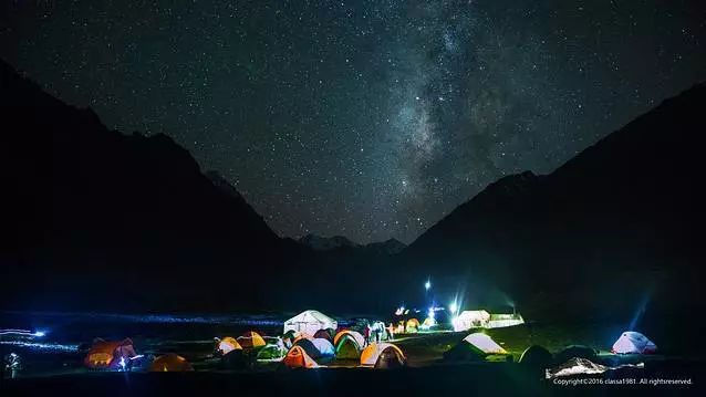 在天色变暗前翻过了两个小山坡的我们终于汇合到下日乌且,第一天的营地。这里是个大营地,很多同行的队伍都选择在这里扎营。随着一处处帐篷的搭建成功,太阳也收起了最后一丝余晖,黑暗笼罩了大地。宿营灯点亮了五彩的帐篷,同时点亮的还有五彩的夜晚。