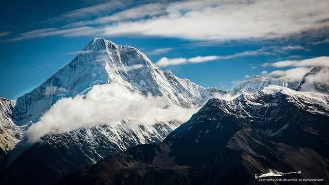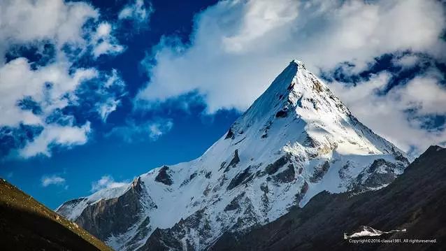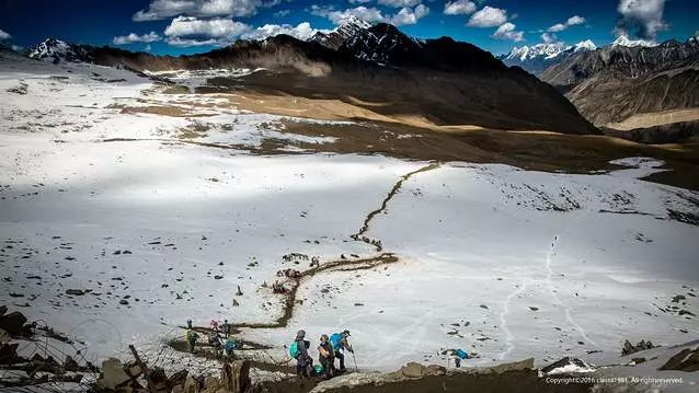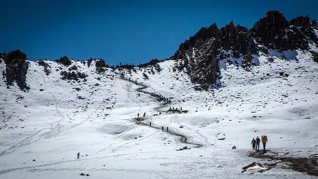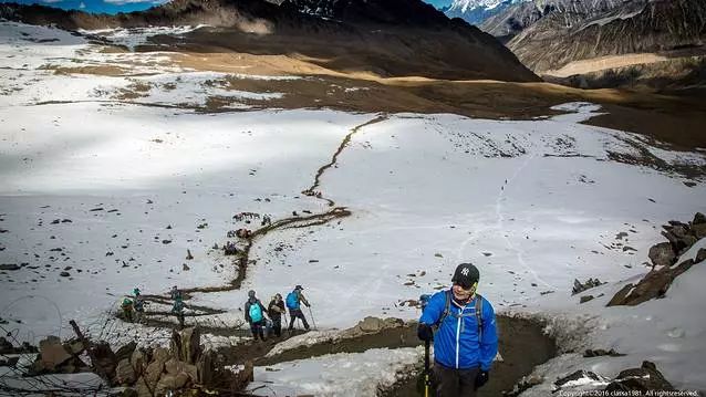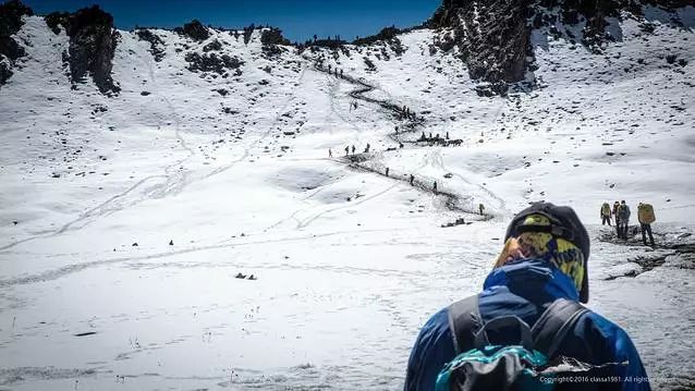 此时高墙雪未消!不觉间踏入雪线,全世界就被白色包围了。不见了草木,不见了土地,只有遍地银光;山峰上突兀的岩石像极枯藤老树,上面开满了白色的绒花。漫布的雪原完整的像一块地毯,又或者是一片银色的沙滩,反射着正午的阳光。雪原上延伸的细线,是零星的脚印,交错曲折的通向远方。沿着脚印行走的是翻越者,坚定的踏在前人的步伐,一步步的攀着。