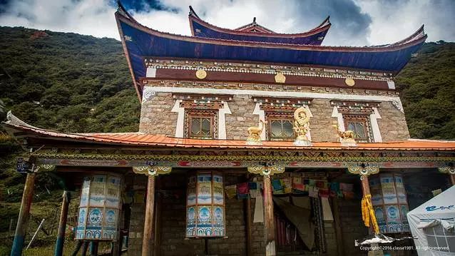 十分钟的路程后,一做四合院似的建筑出现在了眼前。这个就是藏传佛教噶玛噶举教派的三大圣地之一贡嘎寺。正殿供奉着噶举三祖师玛尔巴大师、米拉日巴,塔波拉杰和第九世雪山法狮子贡噶呼图克图法像。常年的供奉让这座殿堂里充满了神圣的气息,让走入其中的人顿时充满了敬畏之心。大殿两旁分别立着护法殿、观音殿,而转经筒则像记载者一般承载着每一个朝圣者的印记,见证着每一个转经者的虔诚。天上浮云飘过,仿佛白驹过隙,仿佛一刹那又好似一生。时间在这里变得转瞬即逝又亘古绵长。