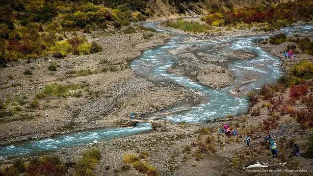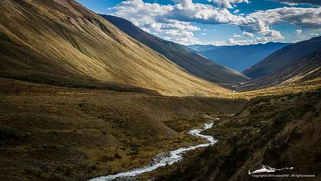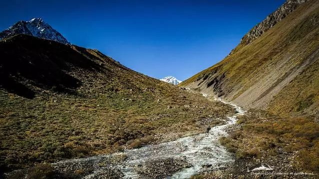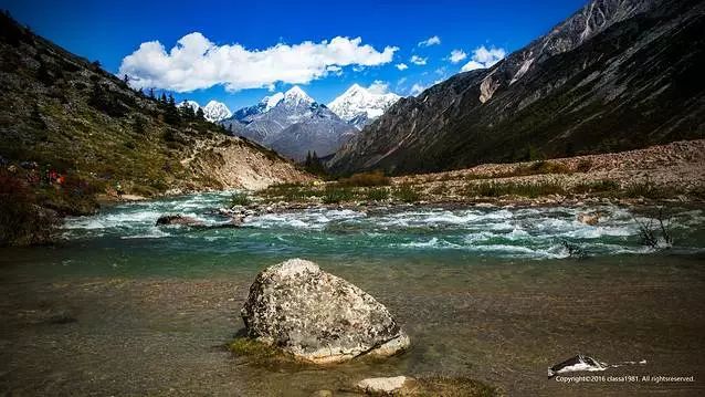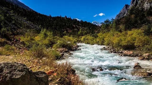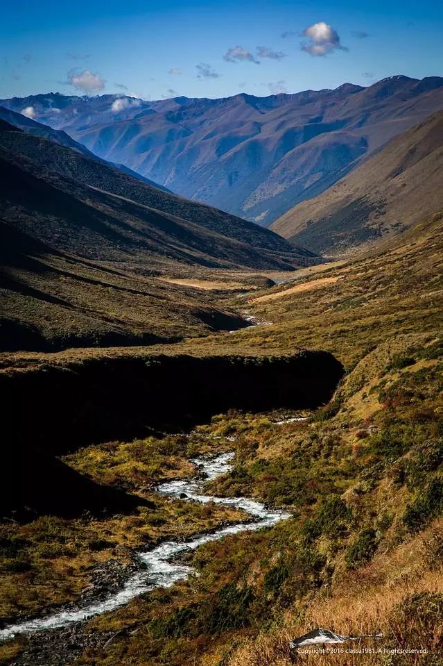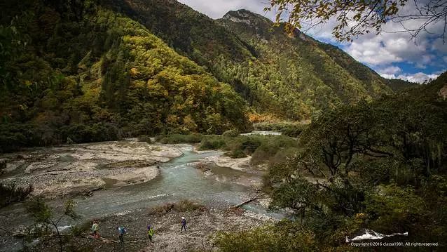 远处的日乌且哑口将贡嘎沟分为了莫溪沟和日乌且沟两段。而这两个沟就是我们转山的全程。前半程从老榆林进山沿着日乌且沟攀升至日乌且哑口,翻过垭口后,后半程顺着莫溪沟一路下降至巴望海后出山。这条溪流就是贡嘎、小贡嘎等雪山融水汇聚而成的,沿着日乌且沟一路向东。
