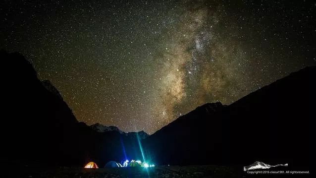 凌晨四点半,万物还沉睡在梦境中,早起的人们已经披星戴月踏上了新的征程。头顶上,近处的天空还笼罩在云雾中,远方的天空却一片星光闪烁。神奇的贡嘎,神奇的天空。