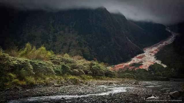 激荡的溪流冲刷着两岸的石滩,也冲刷着石滩上随处可见的红石头。在贡嘎沟或者海螺沟,有些石头是会穿上喜庆的红衣,成群成片的染红了山野。这个奇观的缔造者,是一种原始的藻类。这些含有类胡萝卜素的生命依在石头上,赋予了这片天地新的色彩。