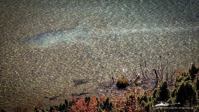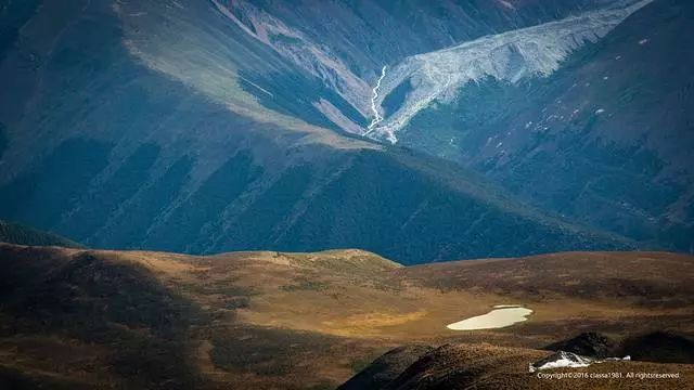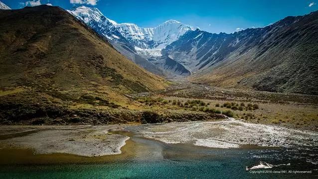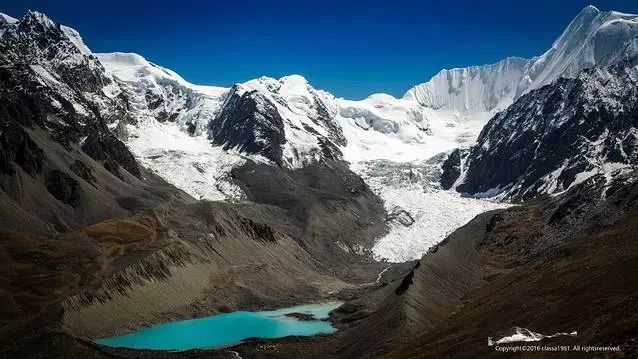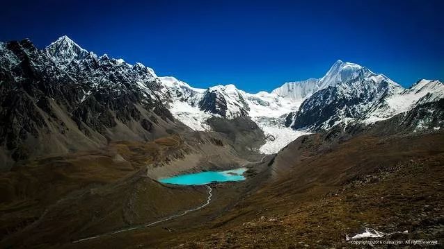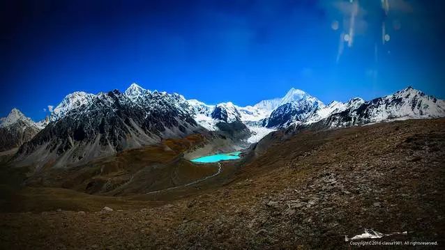 翻越还在继续,脚步仍未停止,恍惚间一道绿光摄入眼帘。在天地荒芜间,在黄白的交汇间,一汪碧水呈现在了眼前。在山边,在冰川尽头,静谧的海子像被遗落在深山中的璞玉,简朴,真实,纯洁的让人怜惜。远处的冰川壮阔,奔放,仿佛洁白的骏马由高耸的冰山驰骋而下,势不可挡。一路向下,可近至海子边。放眼近处的冰川又多了几分气势磅礴,多了几分担当。水面倒影着天空,守望着日月境迁,承载着千年的等待,静候着那年的归人。