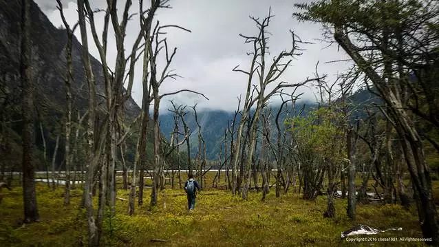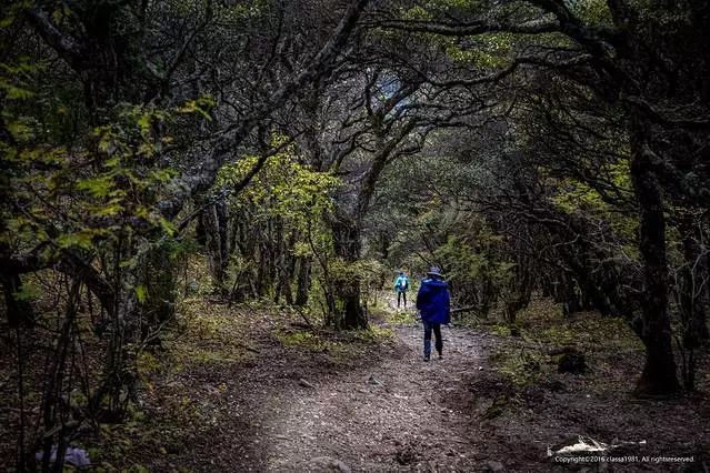 随着海拔的下降,茂密的森林取代了辽阔的草原,占领了莫溪沟的下游天地。这片保存完好的原始森林,延绵数十公里,从眼前望到天边。由松柏和小叶树木组成的原始森林,充满着魔戒故事中的幽幽幻境。粗硕的树干在森林里散落着,苔藓和真菌覆盖了树表,扭曲的枝条随意的舒展着,垂下的树须无风摆动,仿佛诉说着一个个古老的故事。在地面上,树根不甘寂寞的钻出泥土,和旁边的藤类在落叶丛中跳跃着,玩耍着。只有顶部日照充分的地方才有大面积的树叶,为这片神奇的角落提供着必须的营养。
