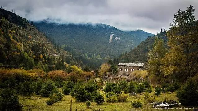 莫溪沟沿途风光无限,其间偶遇当地人搭建的石屋、木帐,映入天为盖地为毯,颇有几分世外桃源之境。