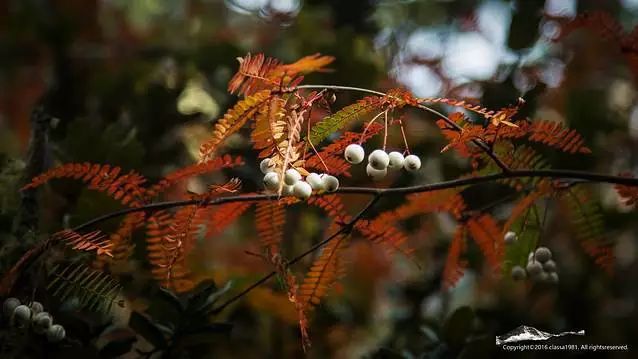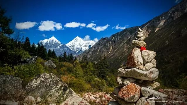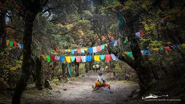 从贡嘎寺沿途返回,岔路口向下,再次进行丛林。也原先的不同,这条山路充满了更多的色彩和乐趣。经幡开始出现在了道路两边,或者蔓着树枝从一侧飞跃到另一侧。树上不知道结的什么果子,玉雕般的洁白圆润,衬着变红的树叶,显得格外诱人。路中间堆起了玛尼堆,洁白的哈达环绕四周。