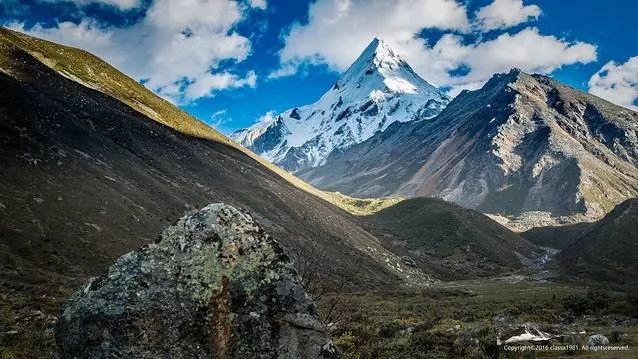 望山跑死马!经过了半天多时间,无数次的穿越和靠拢,这座山始终遥遥的出现在眼前,不远不近的吊着每一个人的胃口。不觉间,两岔河已经踩在脚下了。路旁不知何人堆砌的玛尼堆,遥望着雪峰在寒风中傲立,寄托着每个登山者的信仰,也传达着雪山的祝福。又一次横跨小溪后,左侧的小贡嘎峰揭下了迷人的面纱。海拔也攀升到了 4000 米的高度。转过一个弯角,终于把那座挡在面前的山甩在身后。第一天的考验在无数次的努力后完成了。