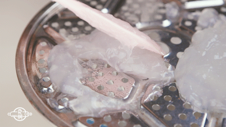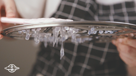 趁热把浆糊倒入屉子上轻轻按压,下面放碗水接着