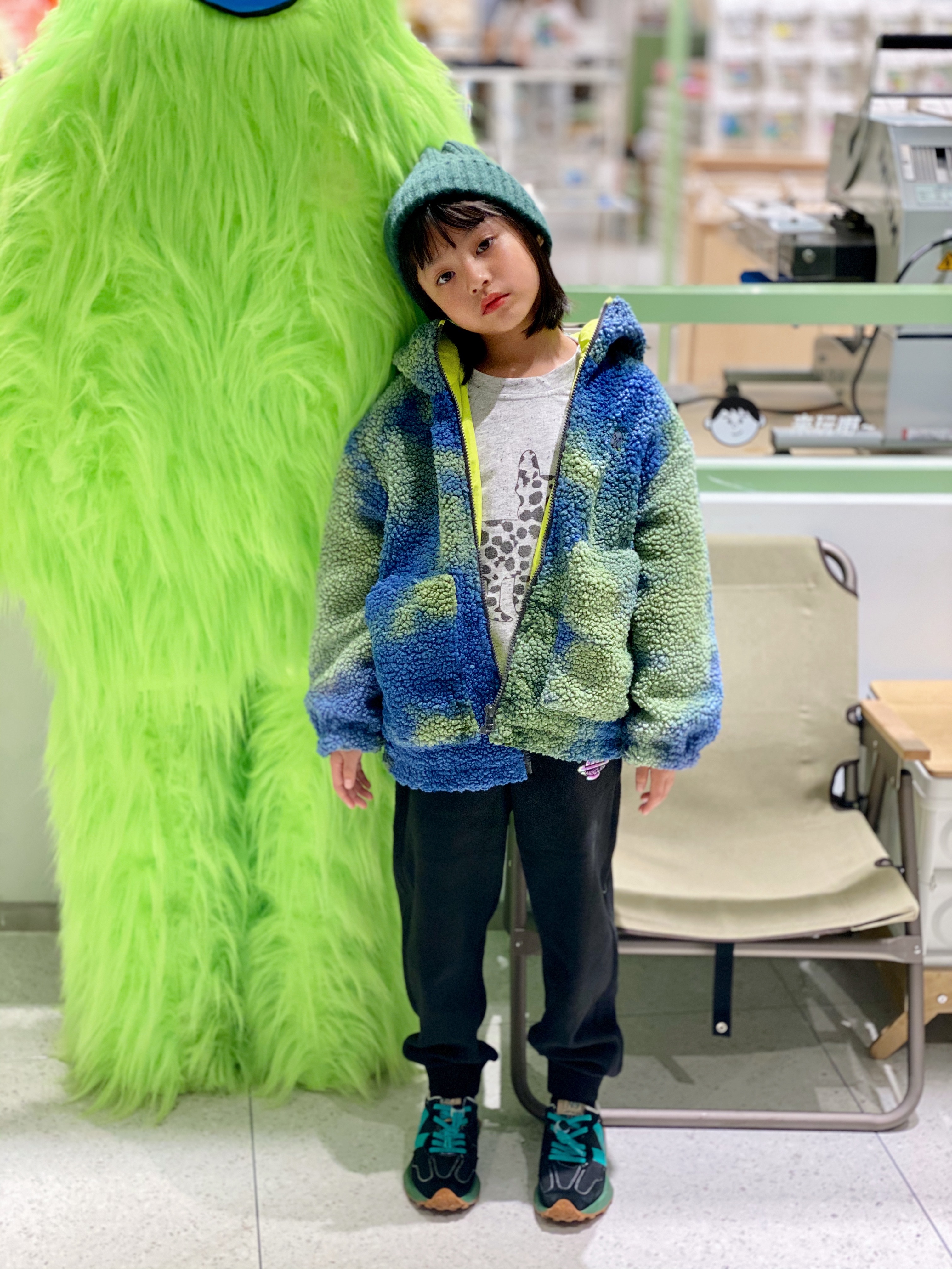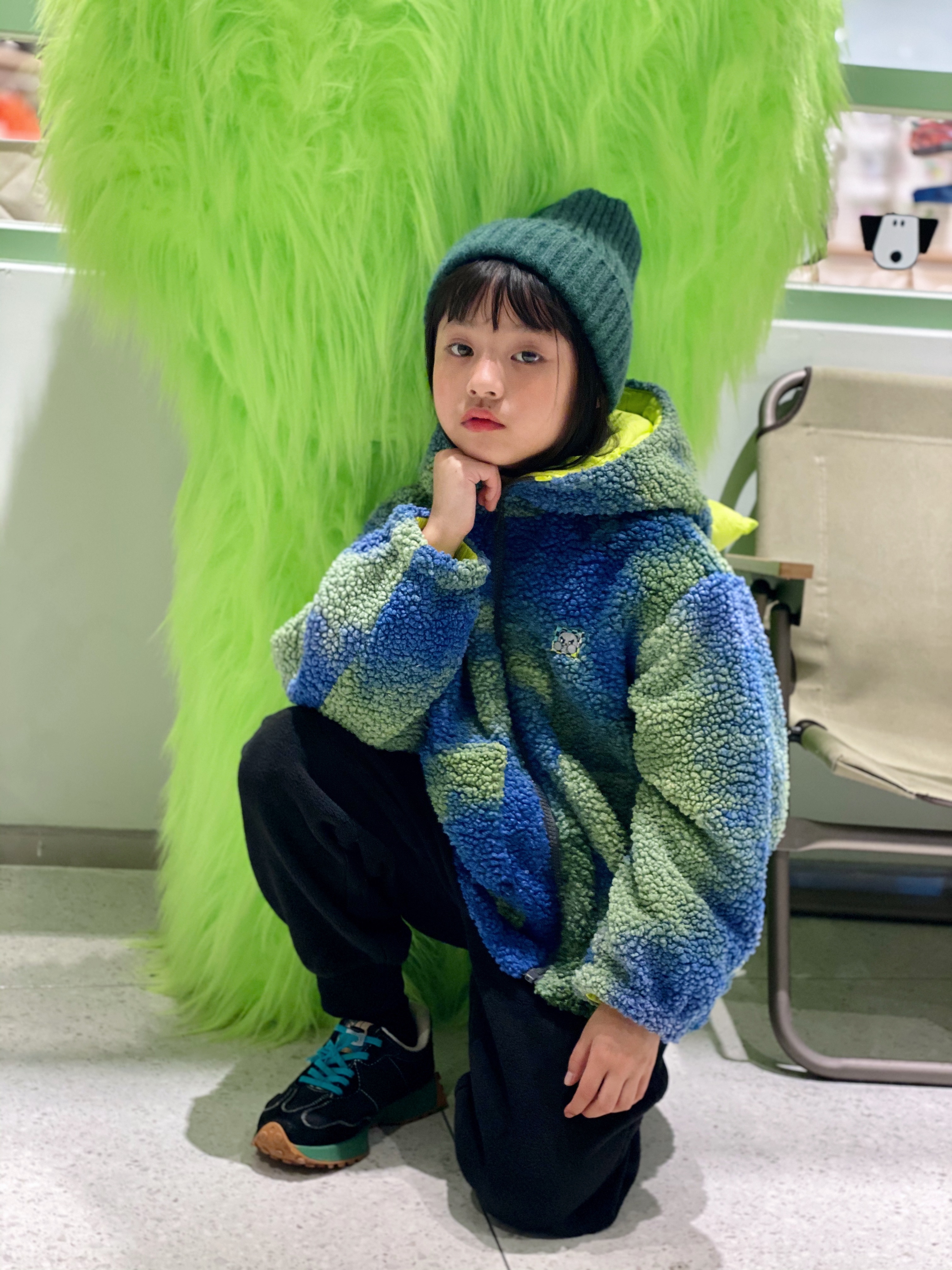 花蓝色羊羔毛棉服搭配摇粒绒休闲裤,冬天整套穿搭保暖又时髦,管他降温还是刮风。