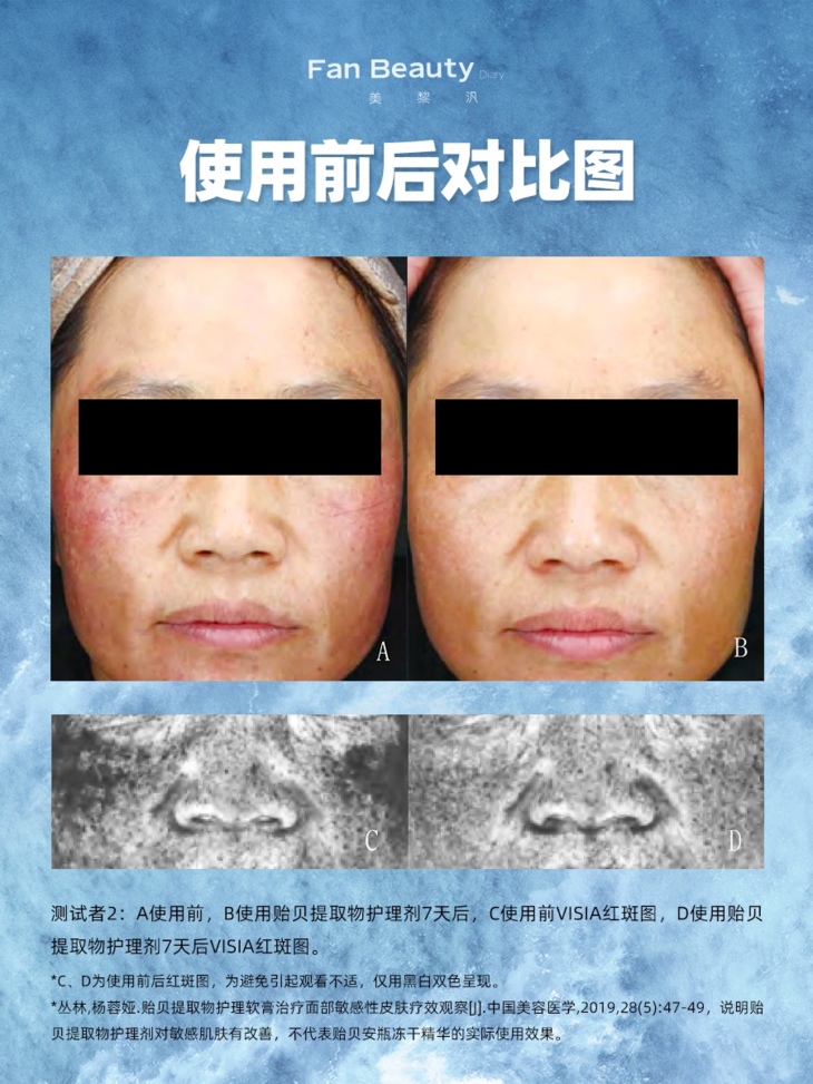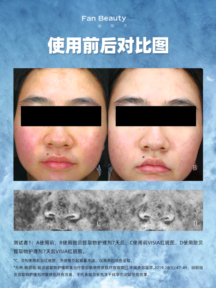 🔍面部敏感的受试者实测,每日使用贻贝提取物护理剂2次,连续涂抹1周,与使用前比较有明显改善。有效缓解敏感问题,能够修护表皮屏障,修护脆弱皮,拒绝敏感反复。
