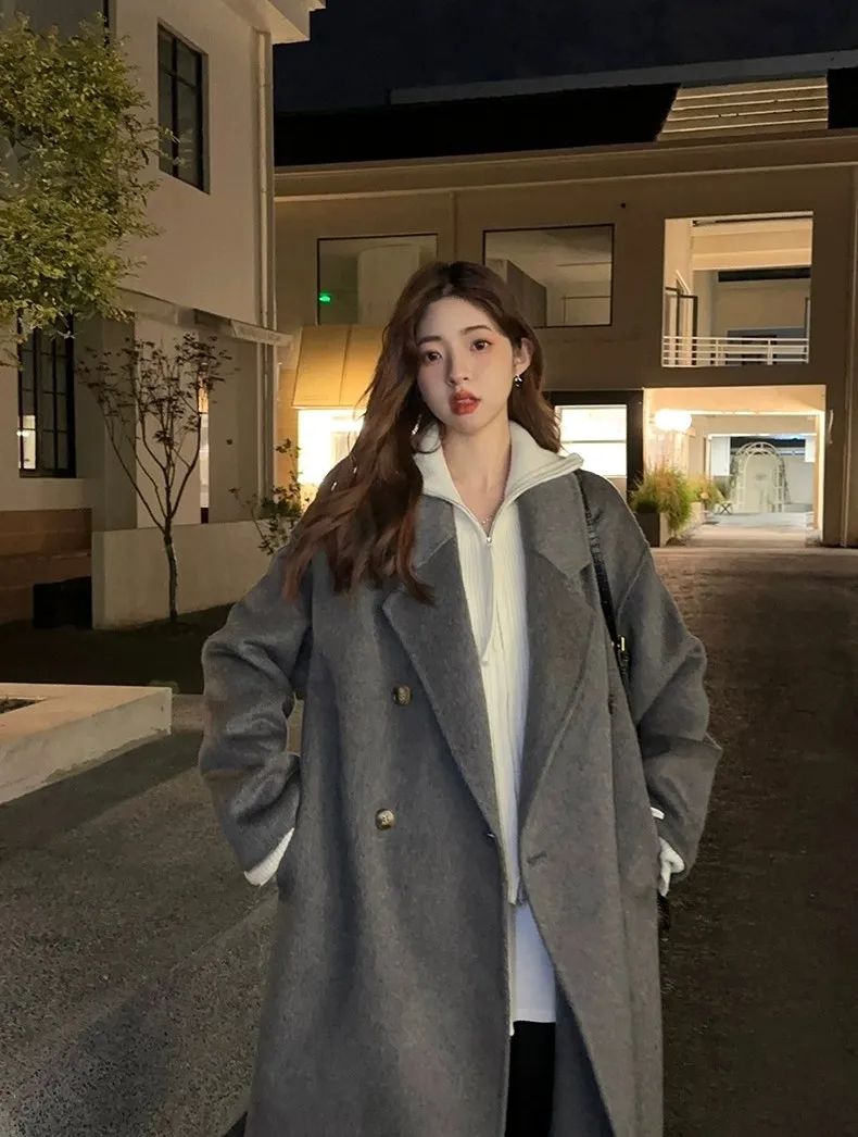 大衣和款式简单的翻领卫衣搭配,不需要多繁复的设计,简单且基础的款式即可,优雅知性不绝于耳。