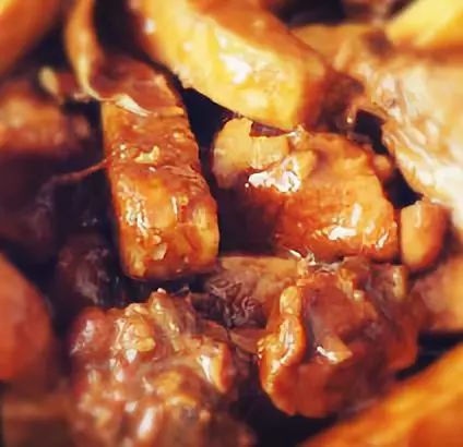 2、放芋头,加啤酒半瓶,盖上锅盖,开成最小火,十二分钟左右,打开锅盖改成大火,汤汁收浓;