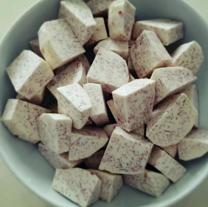 1、用刀把芋头的皮削掉,切成三角块放旁边备用;