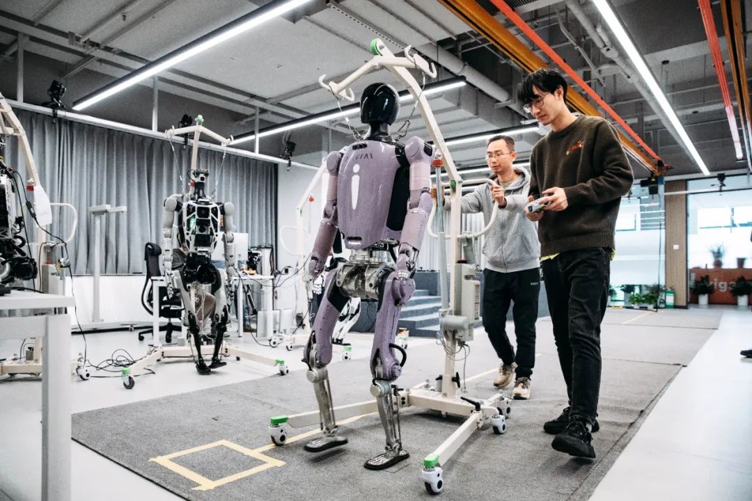 在浙江省人形机器人创新中心,工程师正在对样机进行调试(蔡小川 摄)大模型给机器人领域带来的更深刻的变化,是指出了一条新的道路,那就是“端到端”(end to end)。传统的机器人学把机器人系统分为感知、决策、控制、执行四个模块,如今这种模块化的思路逐渐被“端到端”的架构取代。“端到端”,简单来说,就是只管输入和输出两头,而且只用输入原始的数据,不需要对数据进行分割,中间怎么运算则交给算法来完成,最终机器会从海量的数据中识别出规律和特征,从而得到正确的输出结果。在这期封面报道中,本刊记者采访的加州大学洛杉矶分校工程学院教授丹尼斯·洪(Dennis Hong)提供了一段更加通俗的解释:“在前人工智能时代,我们长期以来对机器人的操控是基于模型,它的原理其实不难理解:我们用数学和物理,把机器人的运动拆解成一堆方程式,然后输入机器人的大脑。就像你给它一本操作手册,告诉它什么时候该迈哪只脚、用多大力气、身体往哪边倾。飞机、汽车也都是这么被控制的。这套方法的好处是可控——你知道它为什么能动,也知道它出错时错在哪儿。但问题也很明显:真实世界变化太多了,模型再精准,也总有想不到的地方。比如地板打滑、风吹、碰了一下桌角,机器人就容易‘蒙’。”而现在,科学家可以不再给机器人操作手册,而是让它自己学。“比如我们给它成千上万段走路、转身、上下坡的动作数据,它就能从里面找出规律。你不用教它牛顿定律,它也能慢慢学会走得稳、站得住。这种方式叫‘端到端’。”如今,在机器人领域,越来越多人相信,通过大规模的数据采集、训练,可以让机器人学会举一反三,从而适应复杂多变的物理环境和动态任务,成为真正的具身智能机器人或者说通用人形机器人。这对我们外行来说,是一条不太容易理解的技术演进之路,但其意义重大,也是当下这一轮人形机器人热潮的实质所在。正是具身智能的提出,把做传统机器人研究的学者和工程师,与做大模型研究的AI专家们聚合起来,开始合力给人形机器人造出一个更加聪明的大脑和一个更加强壮、灵活的身体,让它将来能够在工厂、商场乃至家庭之中,帮人类承担更多的工作。从业者们相信,机器人通往未来的路径已经清晰,只等待突变点的到来。这种信念也正在将产业界、资本界的资源大规模引入人形机器人领域。自2022年以来,这个行业密集成立了一众创业公司,融资金额不断创新高。最新的纪录是,一家成立仅仅50天,尚无任何公开产品的具身智能公司,就拿到了8.7亿元的投资。而不同行业的巨头,如特斯拉、小米、小鹏、美的、蚂蚁集团等等,要么已经入局,要么正在招兵买马。