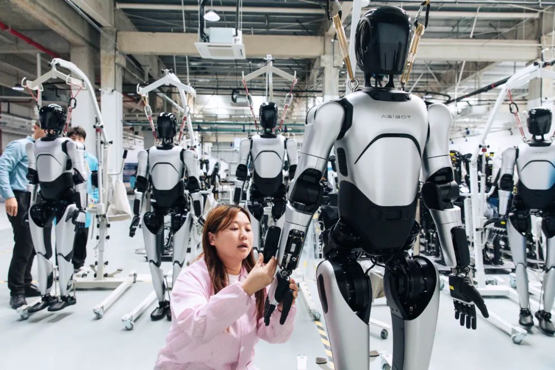 上海智元机器人的量产工厂内,工作人员正在对组装好的“远征 A2”号机器人进行检查(蔡小川 摄)