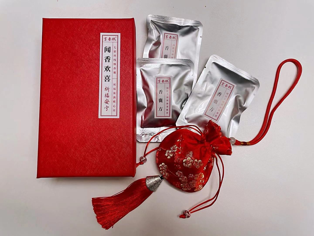 每盒香囊礼盒包装,内含刺绣锦囊一个和药包6袋,每个药包大约能持续使用1个月左右。