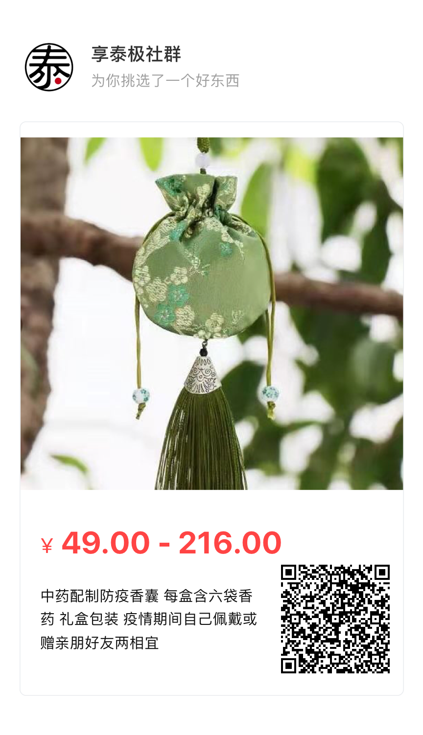 每个香囊礼盒49元,为家人和朋友团购6盒香囊,总共只要216元。春节假期快递不停运。