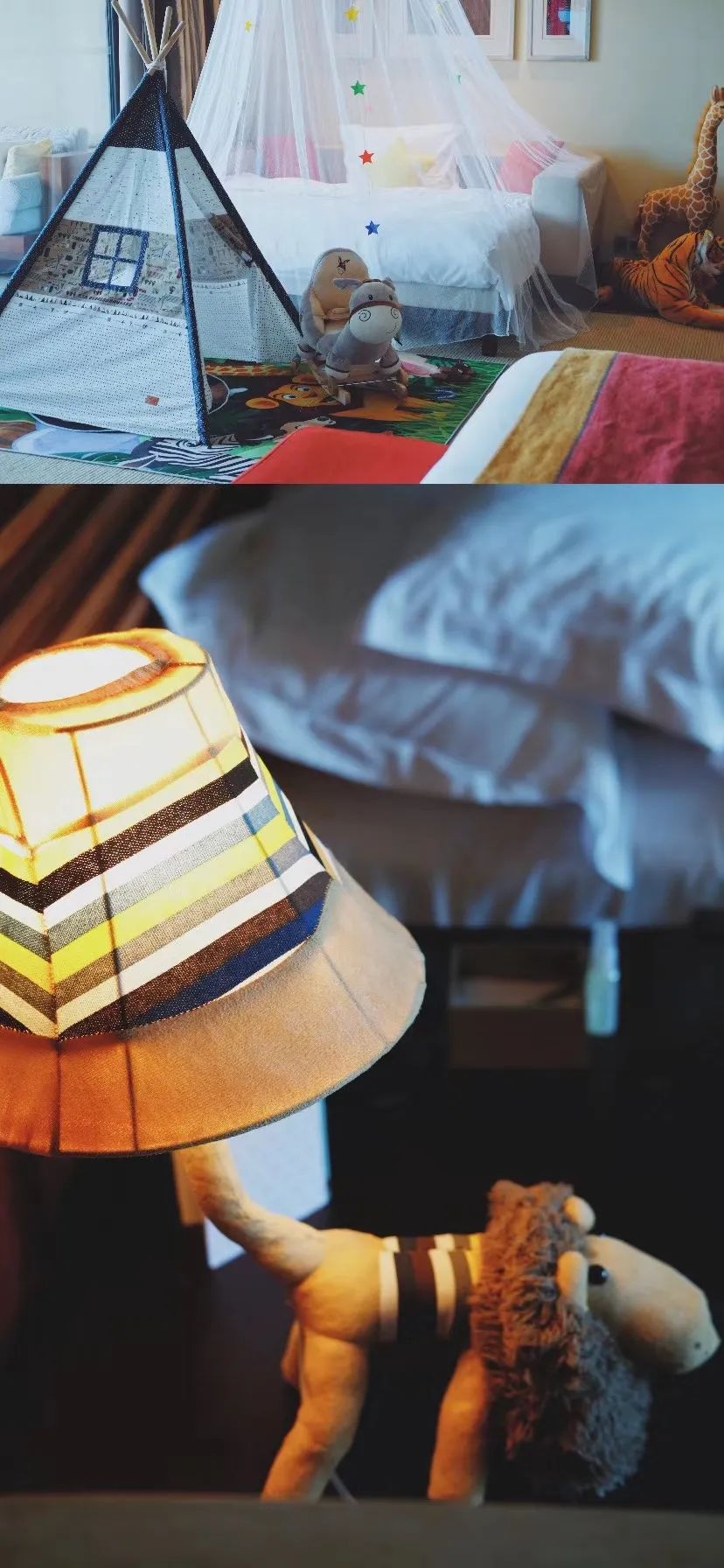 “大”酒店最适合小朋友撒欢了!莱佛士的亲子房只有13间,大小朋友看了都喜欢。80㎡的房内有1张大床、1张儿童床和1个搭在卡通动物地毯上的小帐篷。小狮子“化身”床前灯,长颈鹿、小老虎陪你入睡。