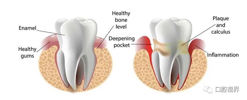 左:健康的牙齿和周围组织;右:牙龈感染、深牙周袋形成