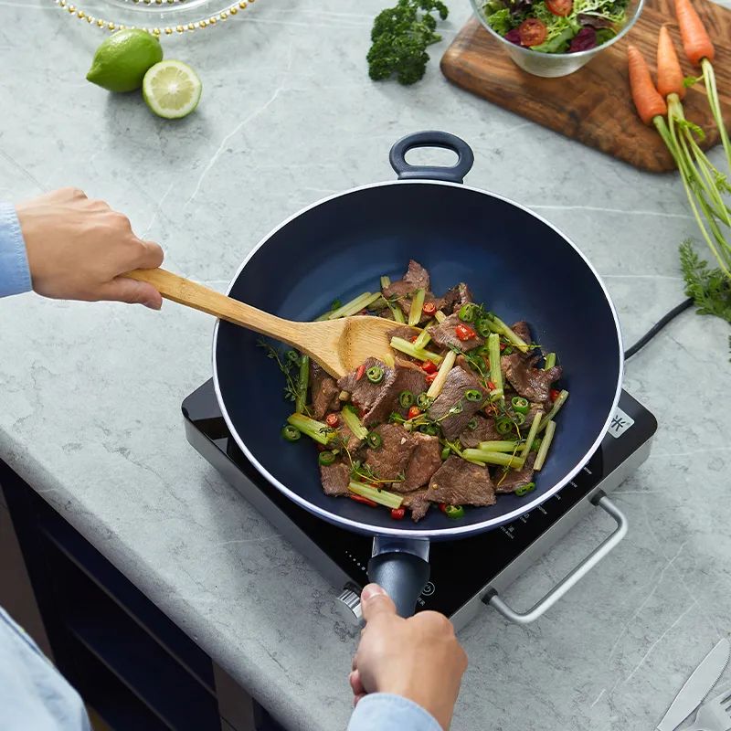 传统不粘锅热的慢、炒菜不香的困境,也一并被它打破。简单说,传统不粘锅,为了让锅能上电磁炉,会在锅底加一个铁片,做成复合底。我之前也跟你们说过,复合底要做得好,才能保证锅子热效率高。我也算跑过国内外大大小小的锅具工厂了,这个工艺还是头一次见,有被震惊到!二代炒锅更是用上前沿技术,使得油不会往锅边跑,空烧少,也能更好保护涂层。而且锅底更薄,锅身更轻,跟电磁炉感应更加灵敏,加热更快更均匀。锅底融合得更好,没有脱落风险,也没有卫生死角,使用寿命更长。锅身重量约1.4kg,臂力好的朋友还是可以轻松颠锅的。力气小也别愁,两端都设计了手柄,要移动的时候也很方便。手柄都是耐热的电木材质,取热锅也不会烫到,非常贴心。
