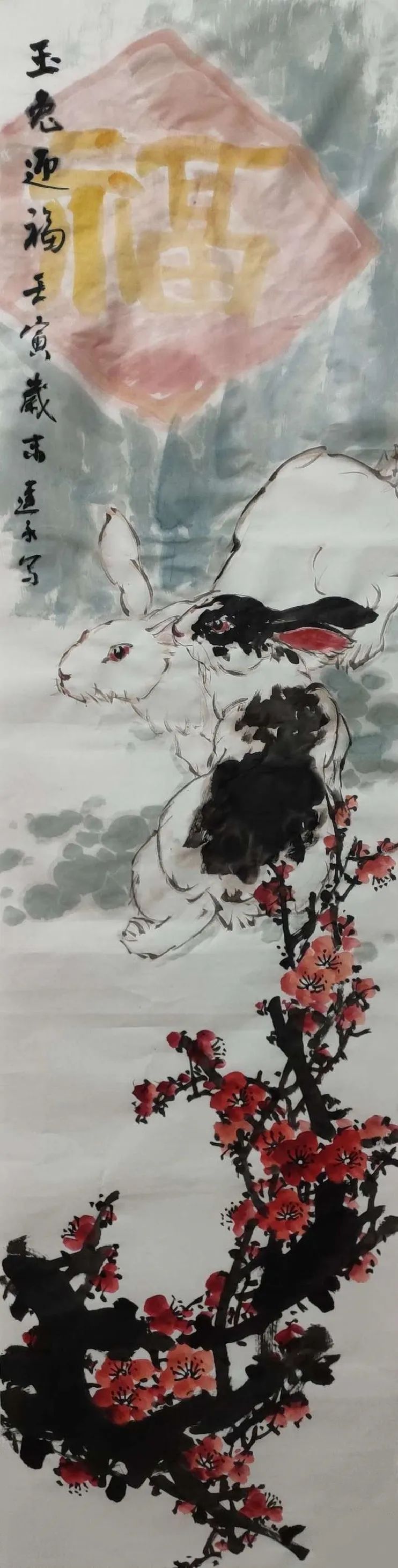 第三步:淡赭石整理兔子,点染局部颜色。写福字,花青渲染整理。最后整理,完成。