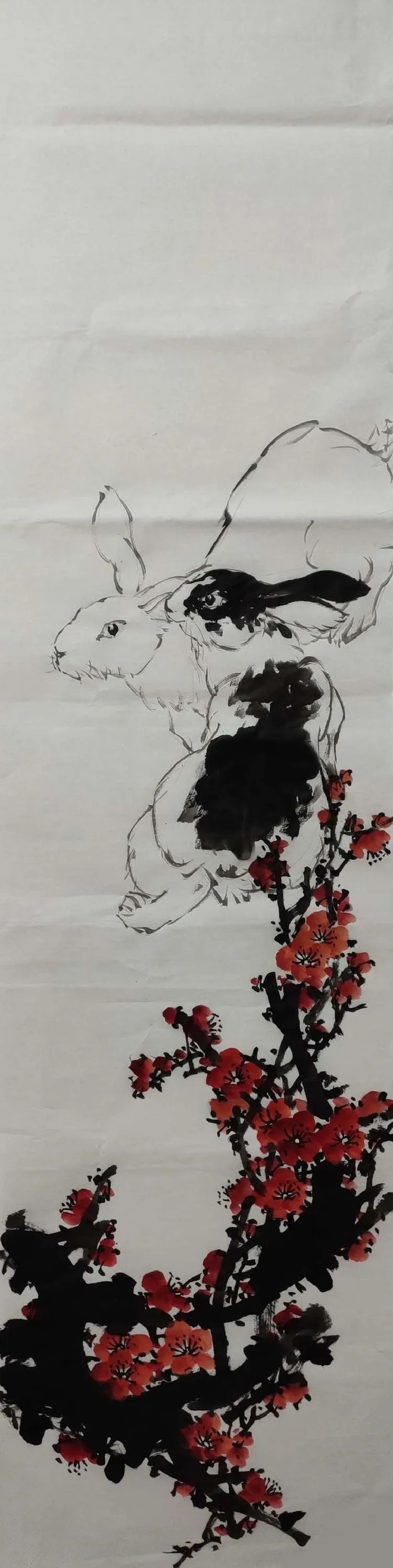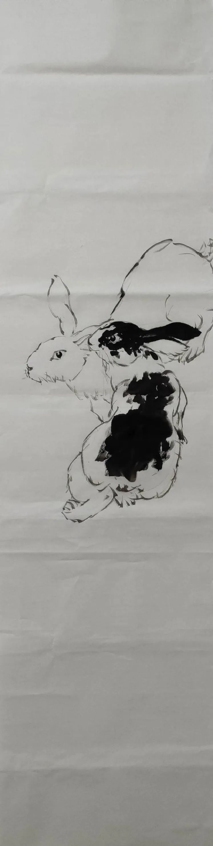 第一步:淡墨勾画兔子形状结构。浓淡墨点画身体斑块。