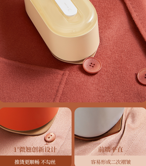 底板前端微翘,可以对衣领、纽扣附近的区域,进行更细致的熨烫。