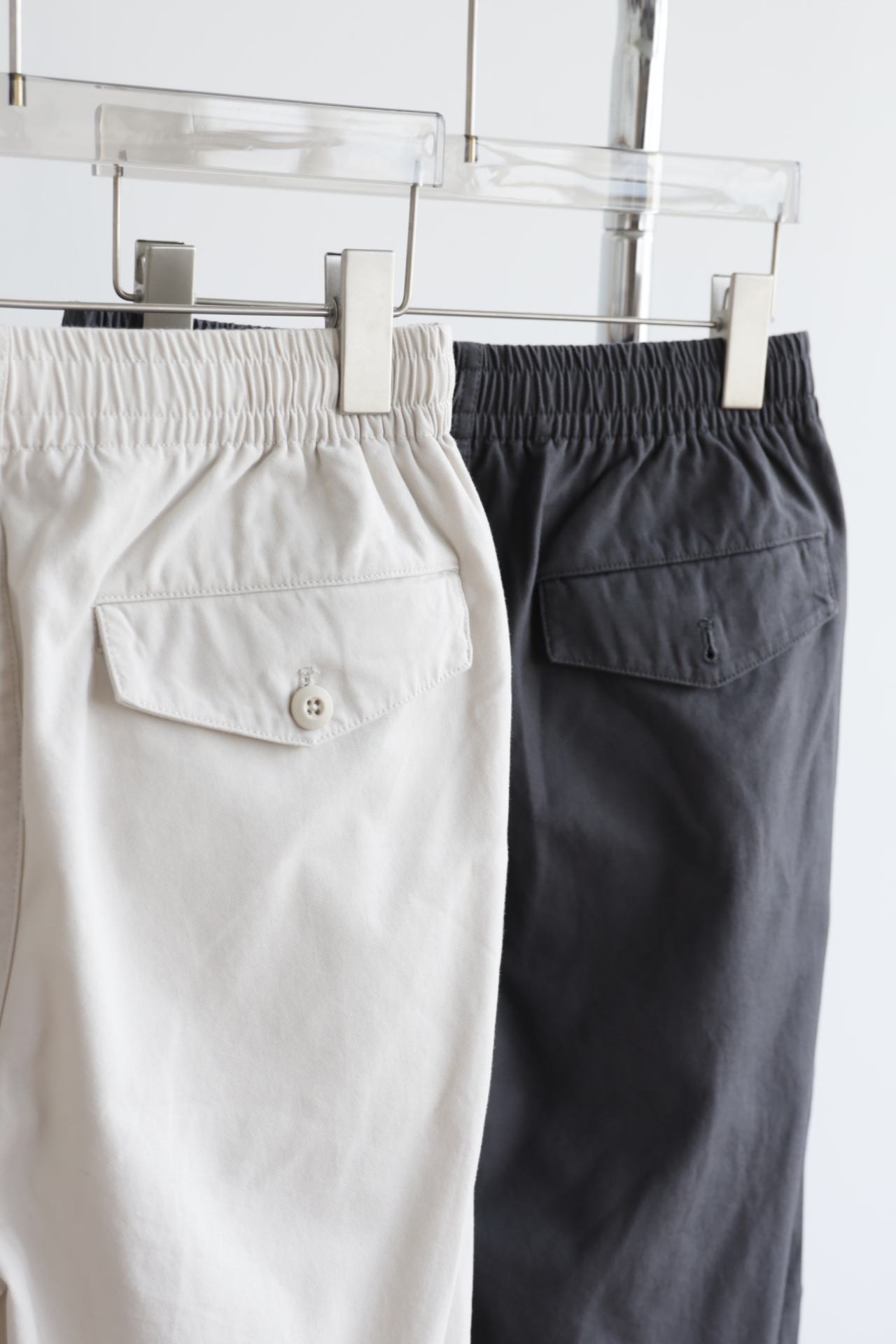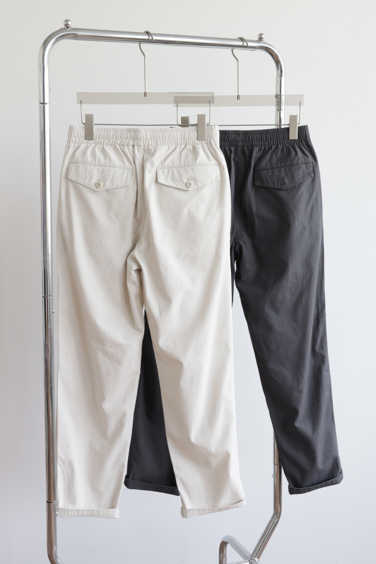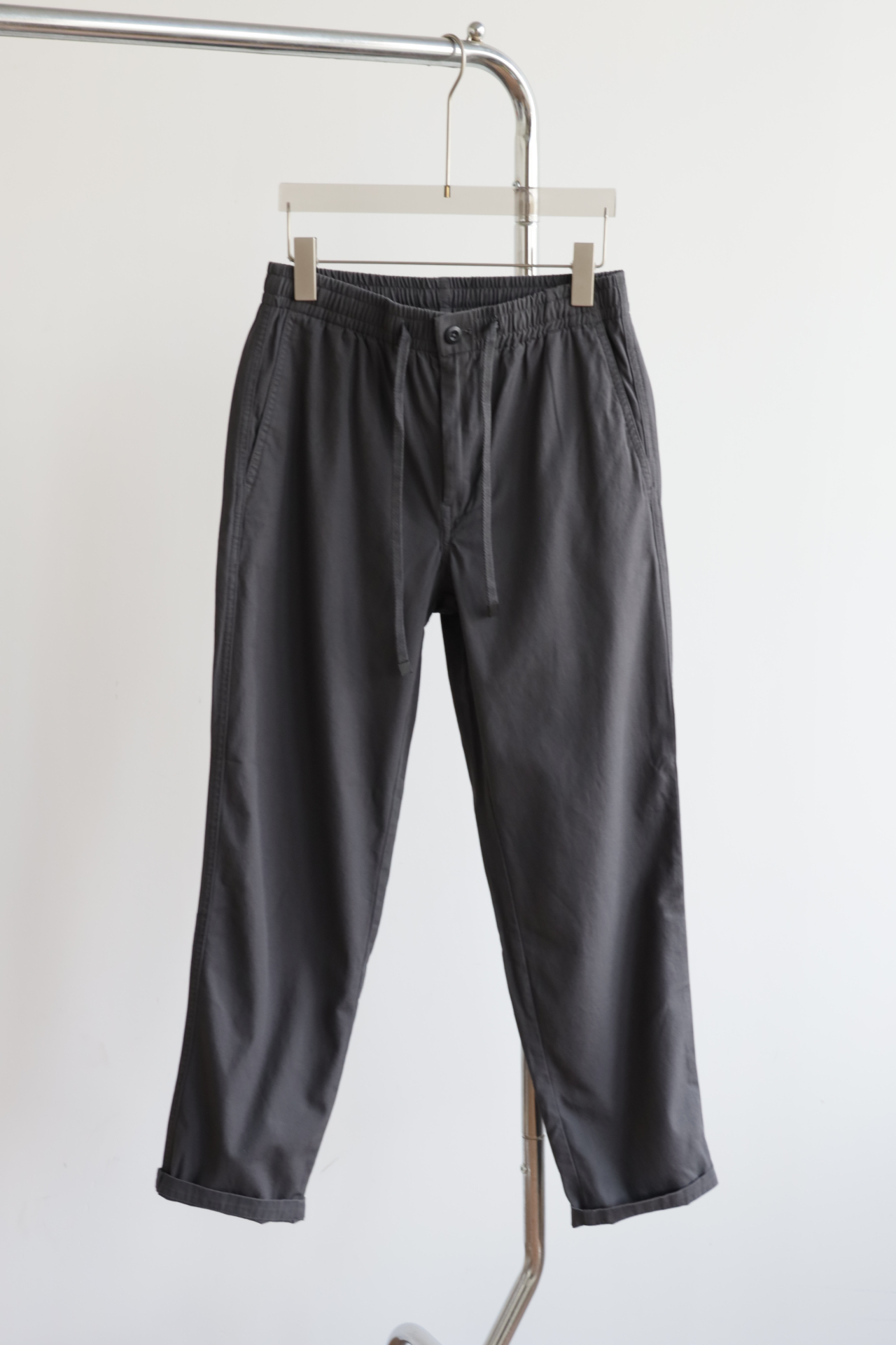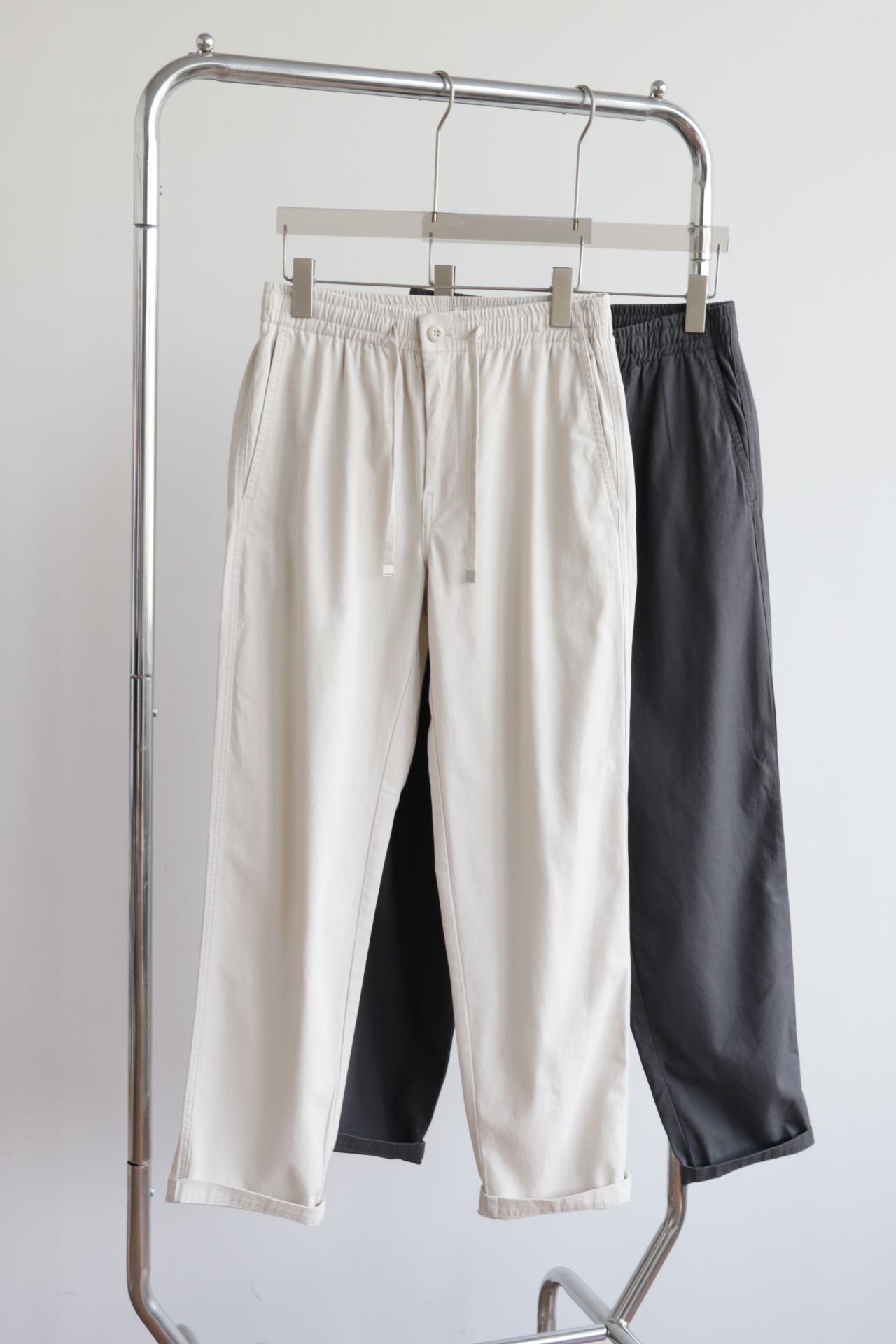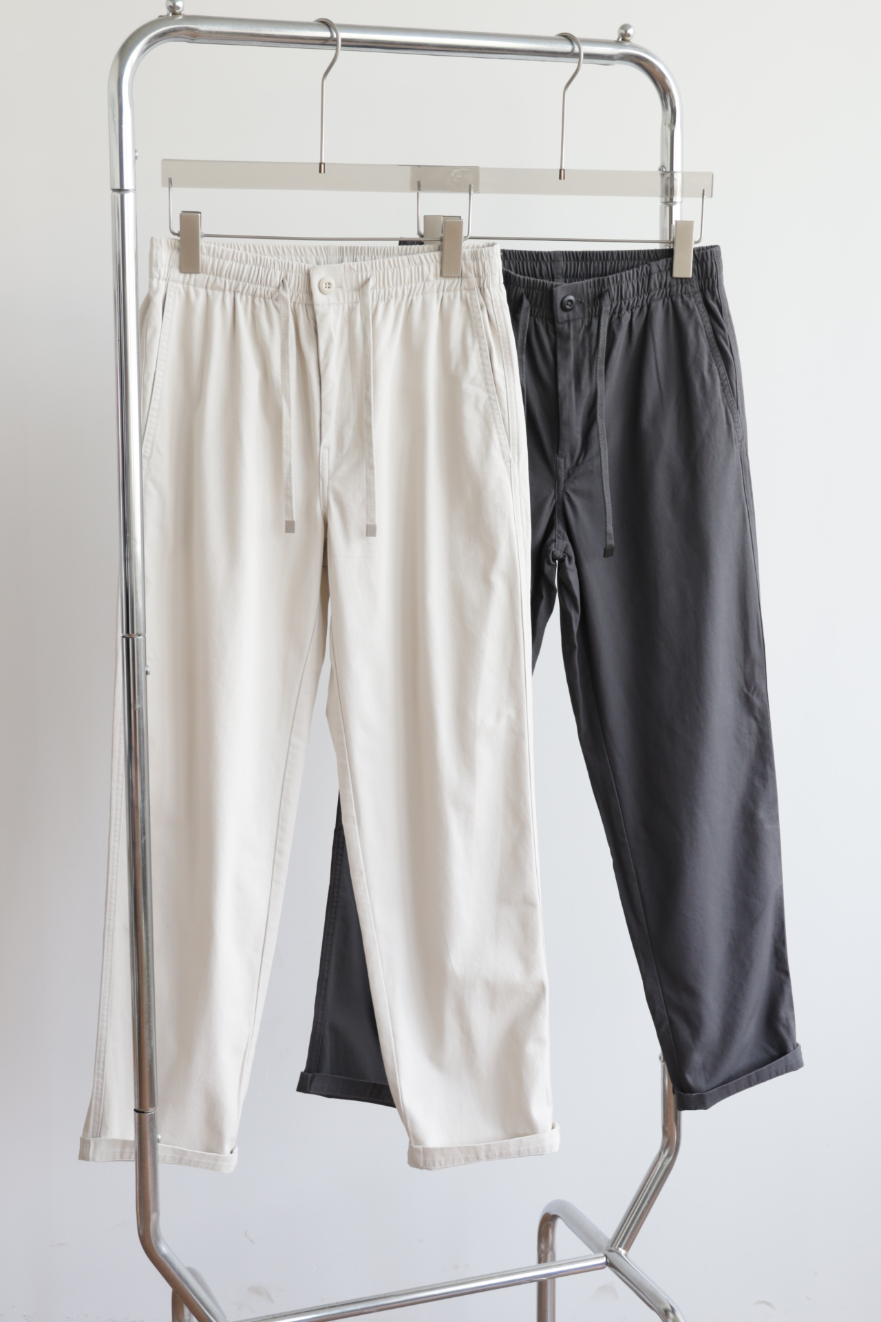 棉涤混纺的斜纹布小直筒休闲式样,很友好的松紧弹力腰围+抽绳,上宽下窄的微锥版型