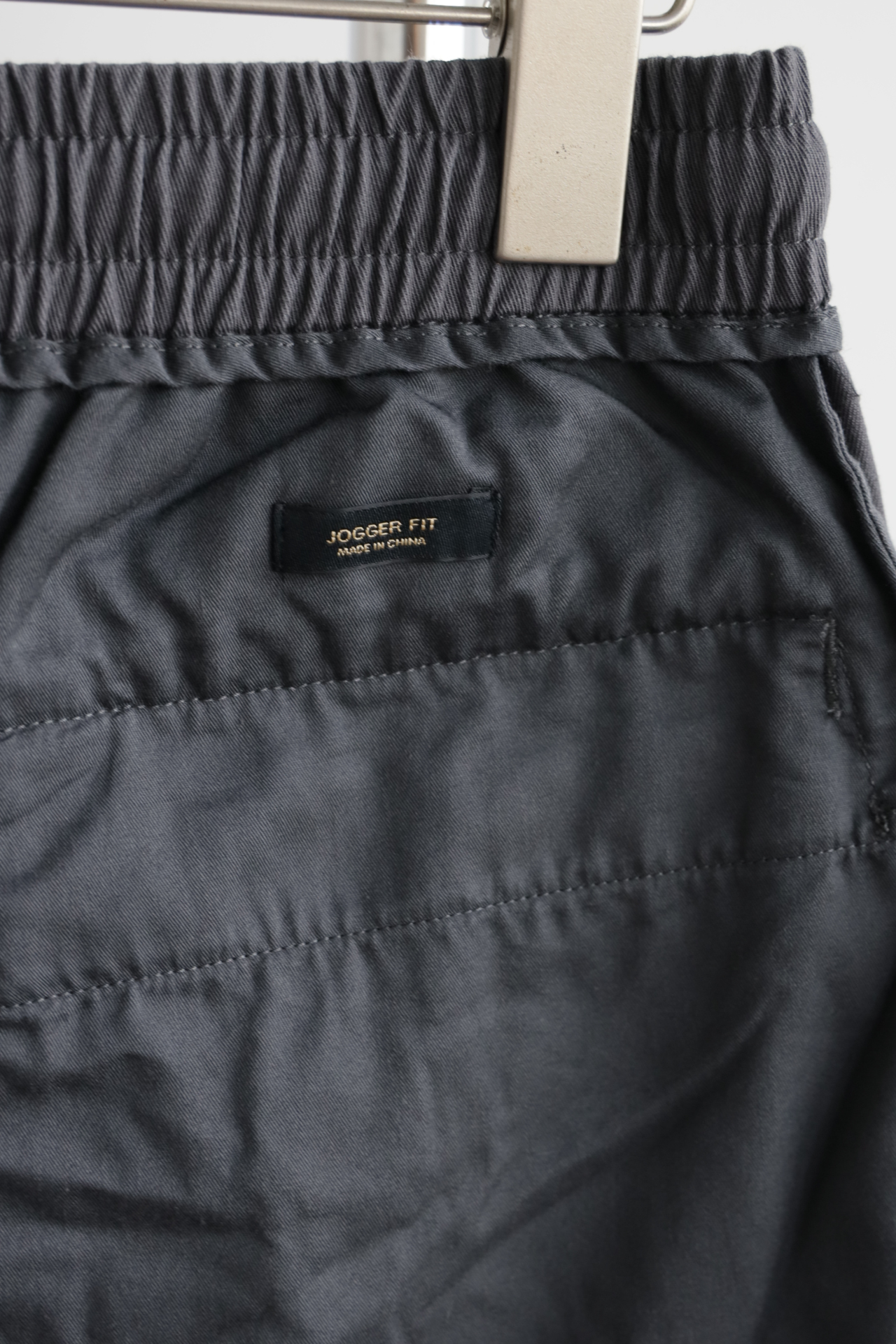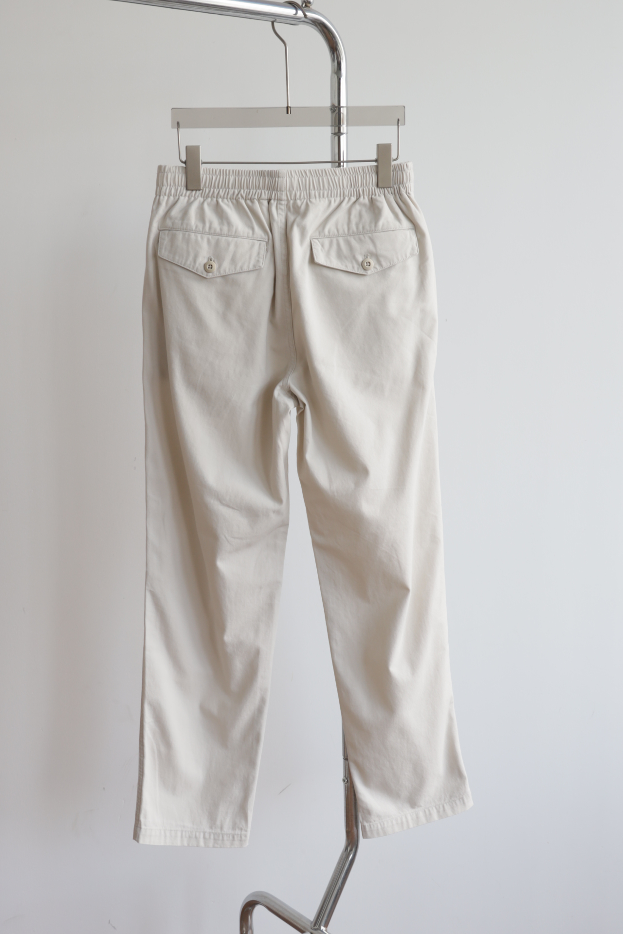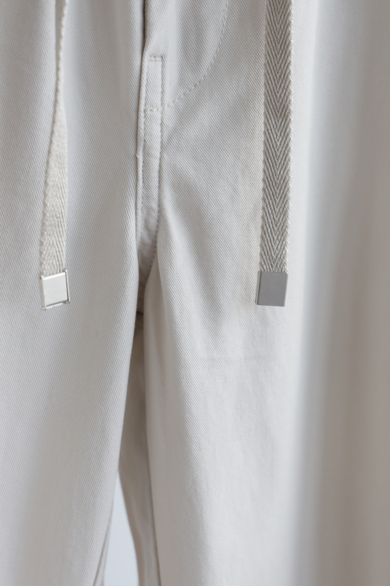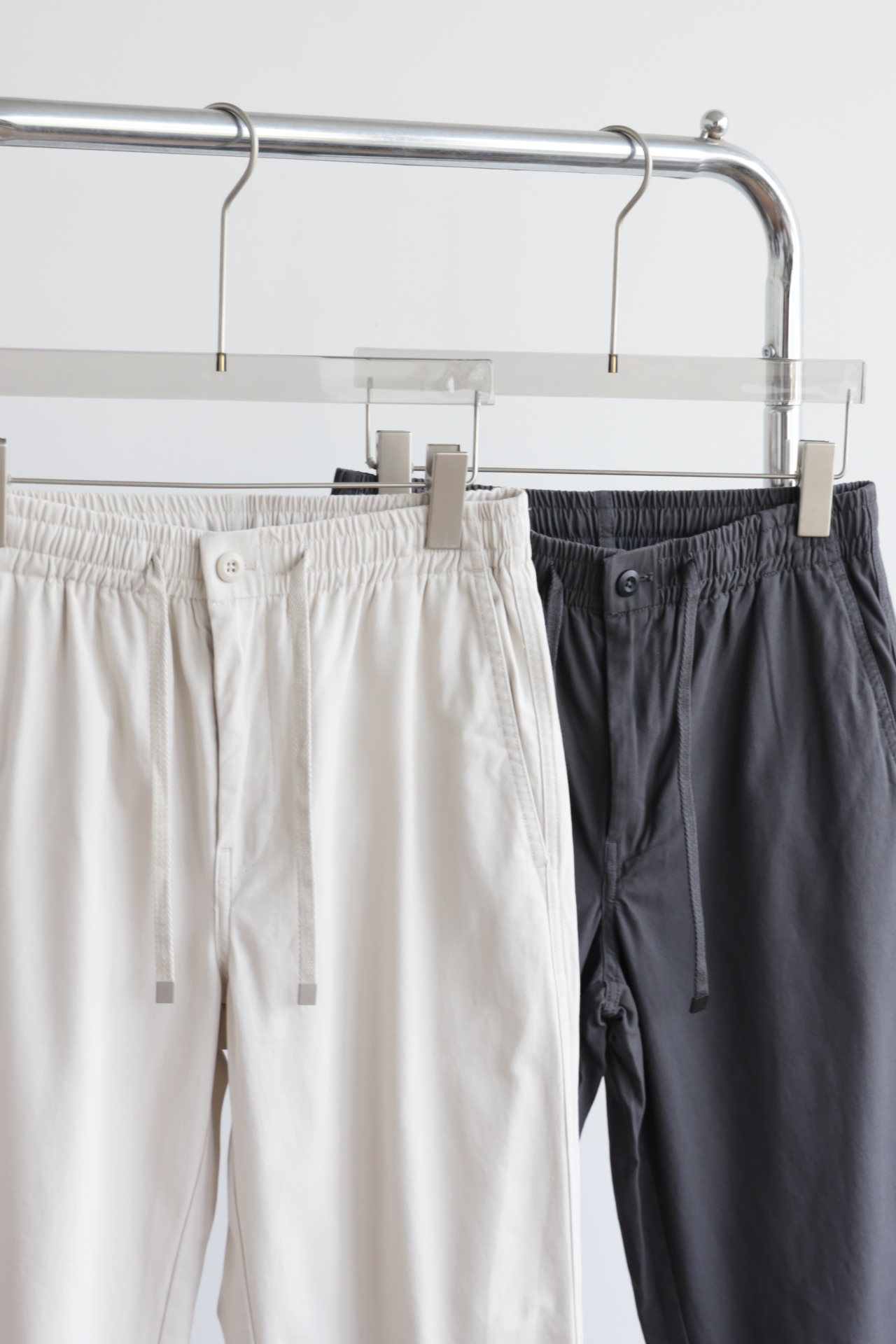 棉涤混纺的斜纹布小直筒休闲式样,很友好的松紧弹力腰围+抽绳,上宽下窄的微锥版型