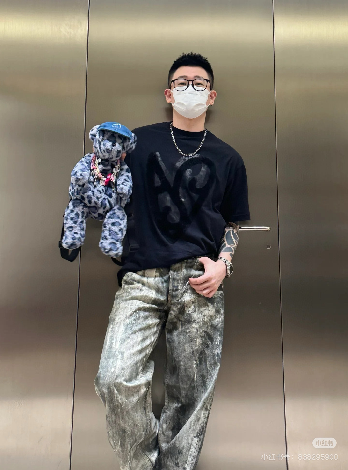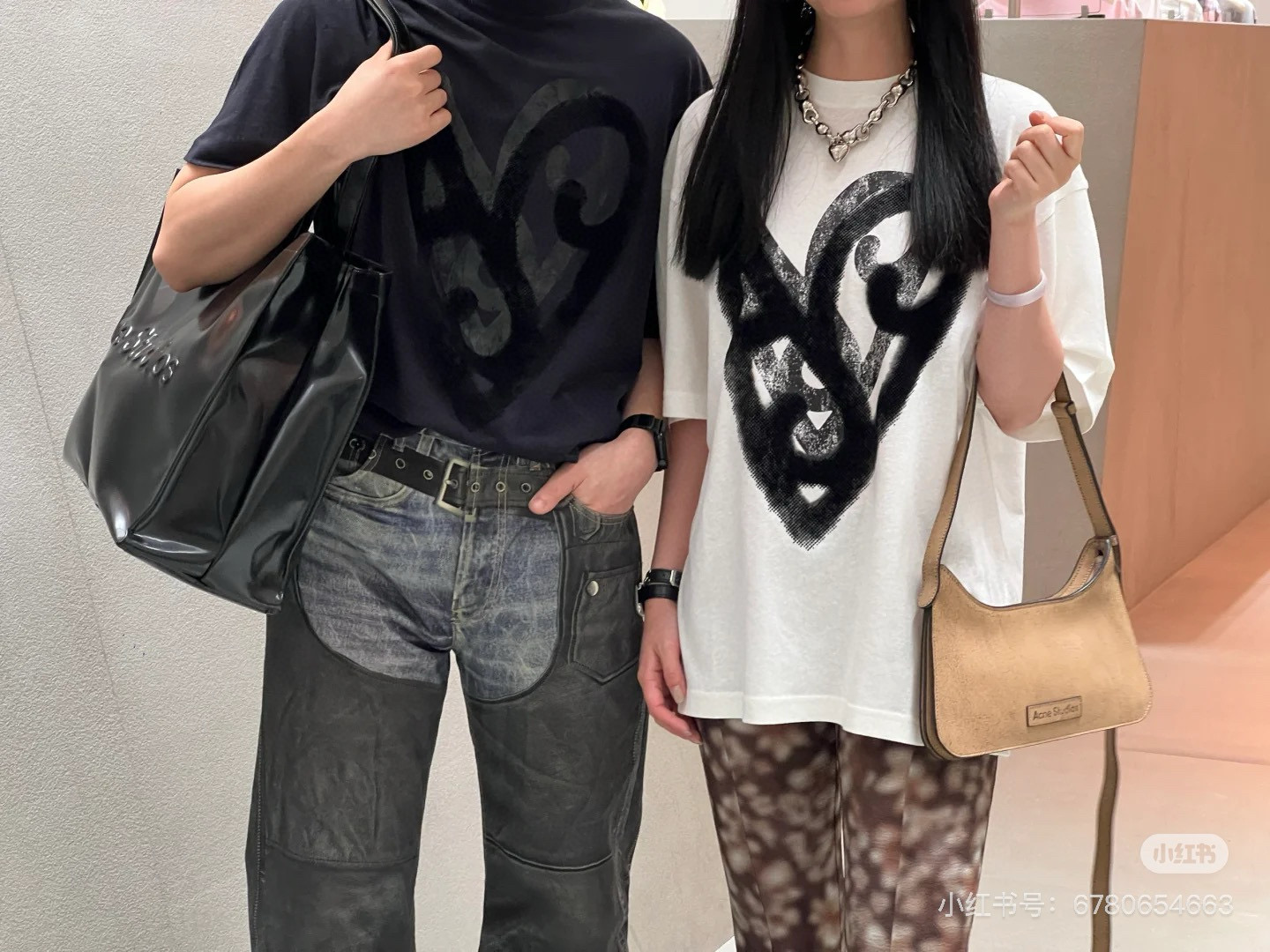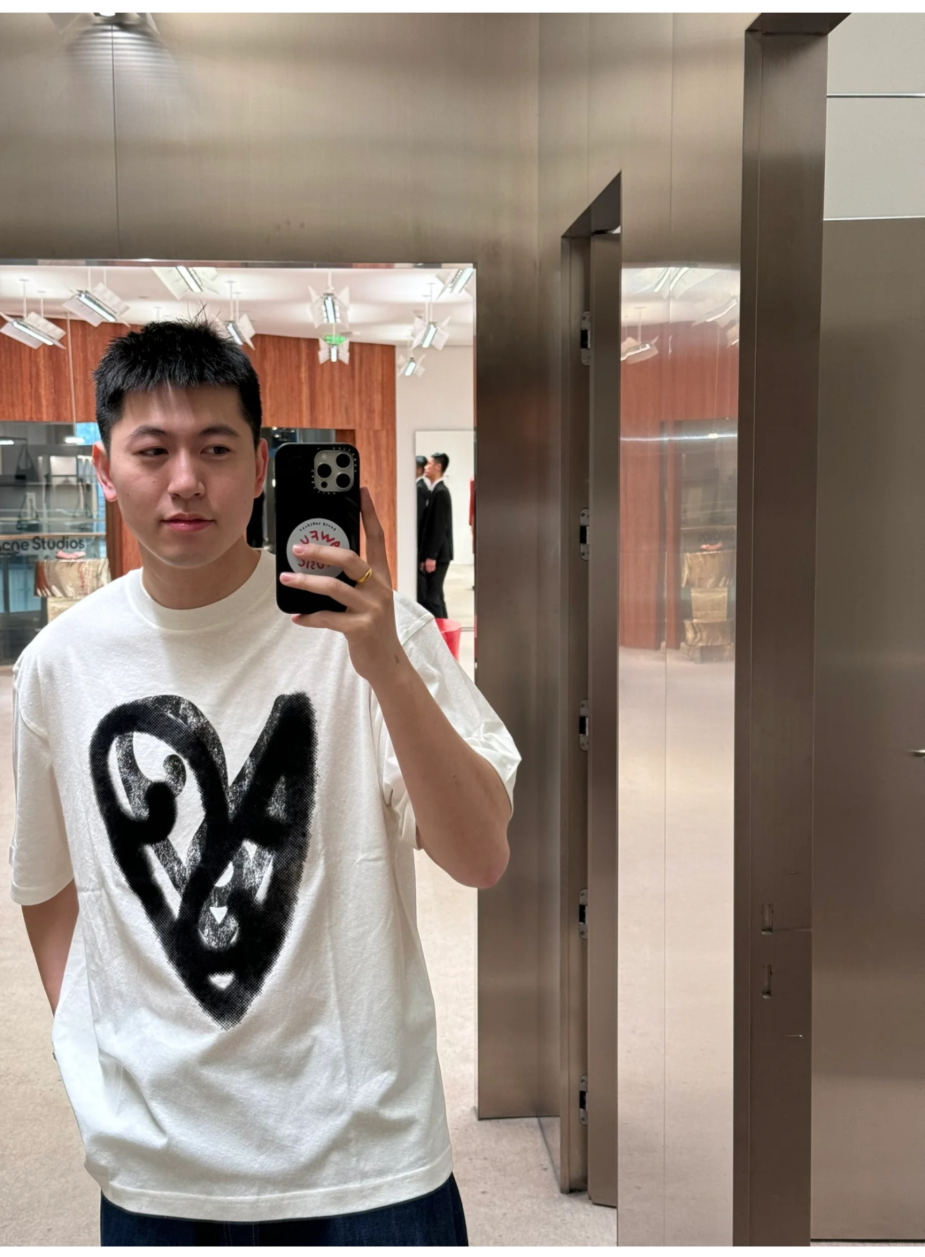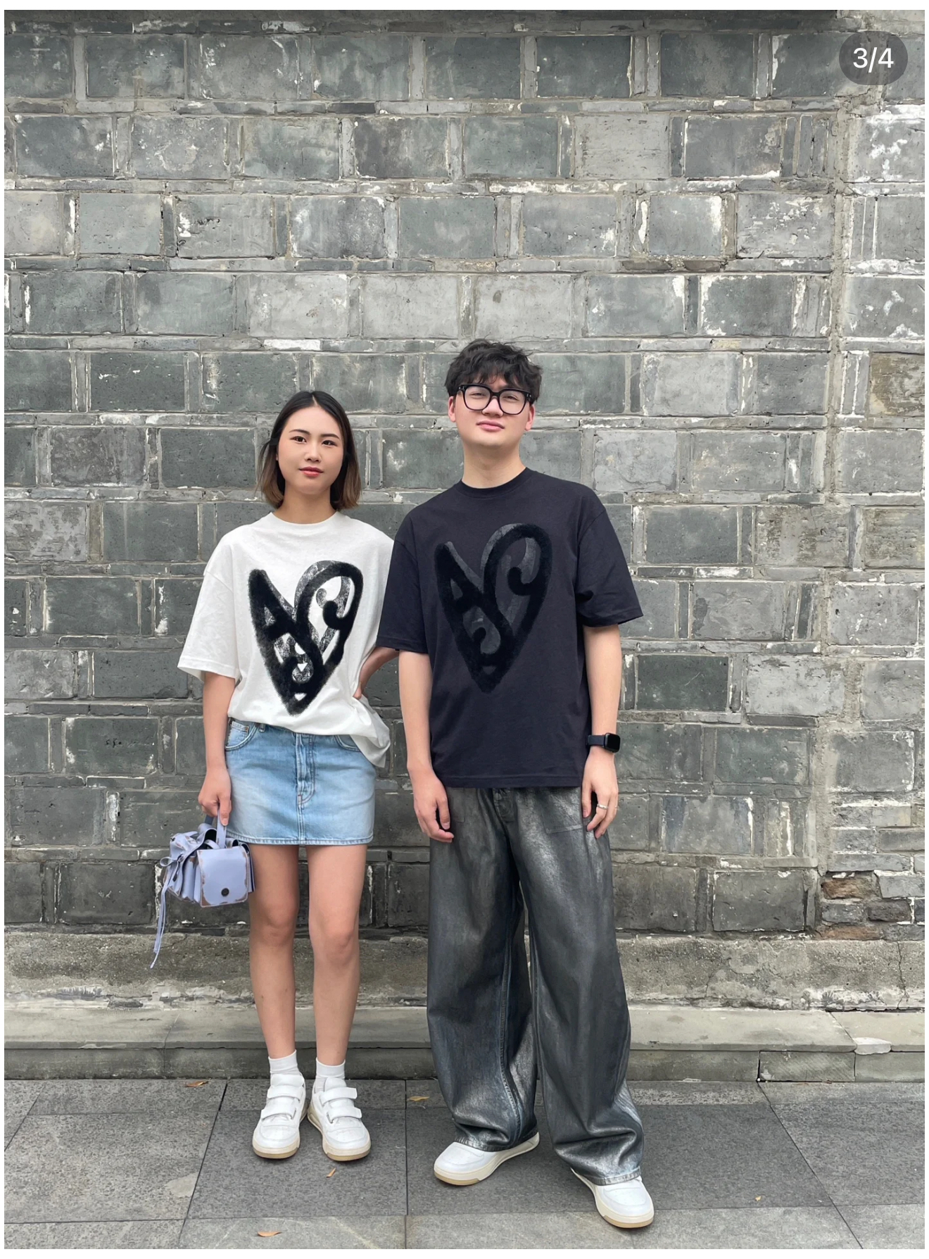 这件T恤的灵魂所在,是复古涂鸦爱心印花叠加植绒工艺、独特的笔触肆意挥洒,爱心的轮廓在抽象与具象间游走,复古的色调与随性的涂鸦风格相互碰撞。