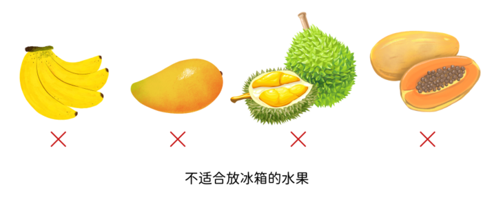 香蕉、芒果、木瓜、榴莲等这类热带水果不适合放冰箱,这类水果合适的存储温度是10度左右,放进冰箱冷藏室,温度过低反而会导致受冻而变质。